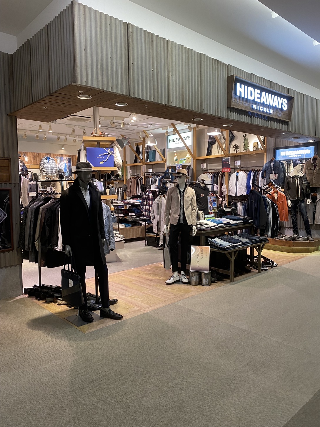 HIDEAWAYS在英文中是「藏身處」的意思。這是一家以希望成年人度過一個優雅假期為理念的充滿童趣的商店。我們經營各種時尚休閒男裝商品,包括我們品牌傳統上提供的服裝和雜貨(鞋子、皮帶、帽子、圍巾、配件、包包)。