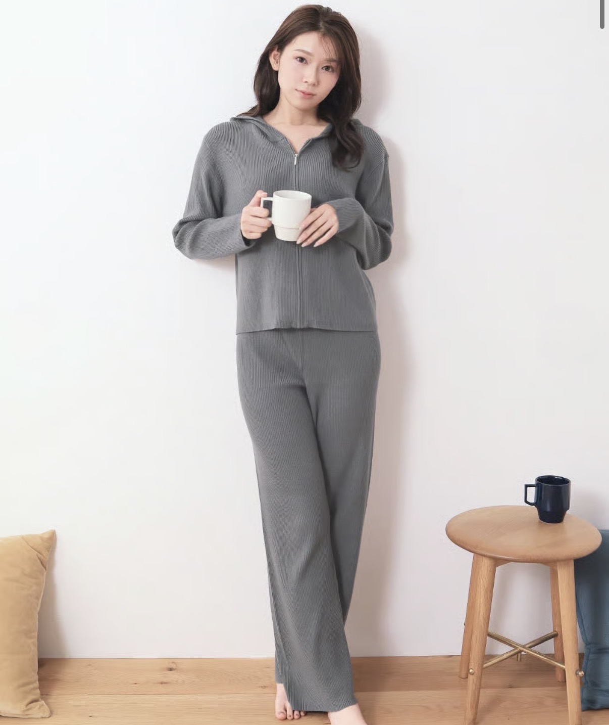 這款全拉鍊連帽衫和直筒褲套裝採用柔軟的羅紋針織面料製成,外觀精緻時尚!