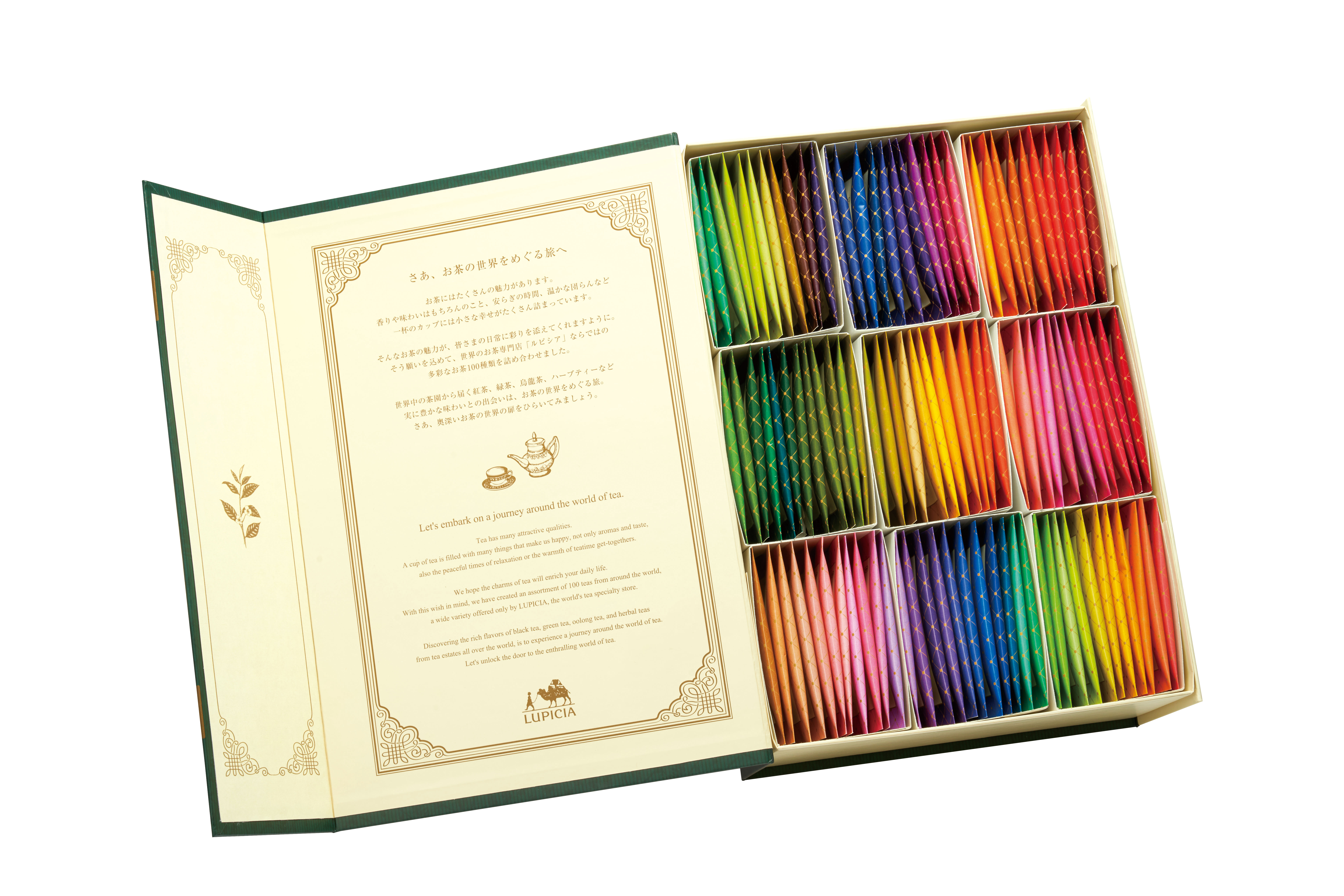 這款茶包組合包含 100 種精心挑選的獨特紅茶、綠茶、烏龍茶和花草茶,全部都是LUPICIA的獨家產品,Lupicia 是一家專營世界各地茶葉的商店。