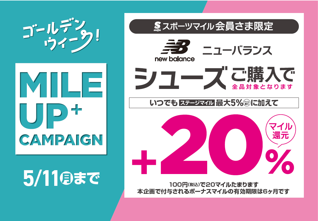 - 【GOLDEN WEEK】NEW BALANCEシューズボーナスマイル付与!