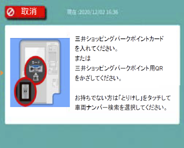 請插入三井購物公園進行分卡。或請<ORG6>描三井買物公園進步分QR番。如未持有,請點擊“取消”,並選擇“搜索車牌號”。