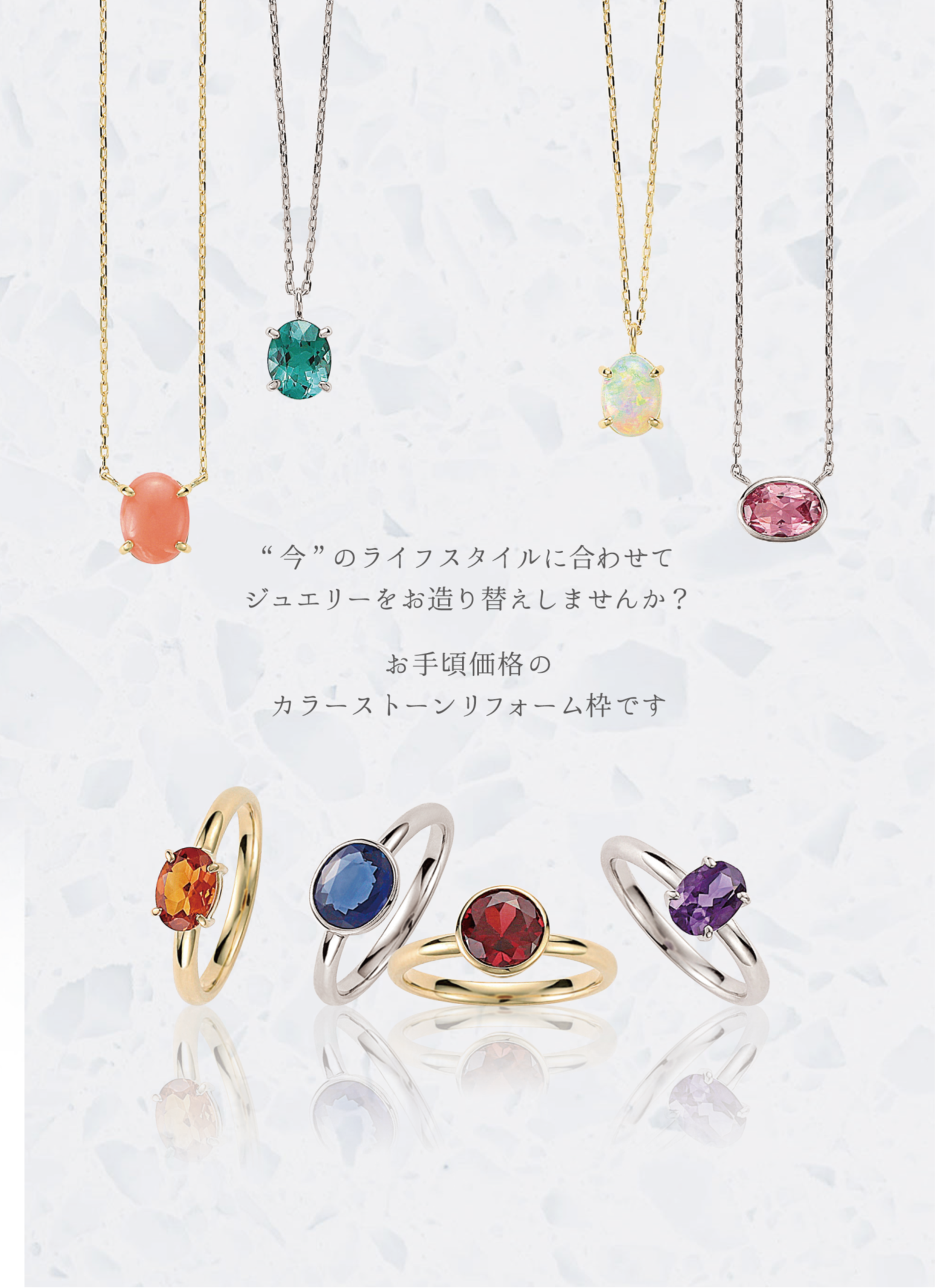J.J.h不進行新的礦山開採,為您準備了多種3,300日元起的可持續的“再生彩色寶石”。