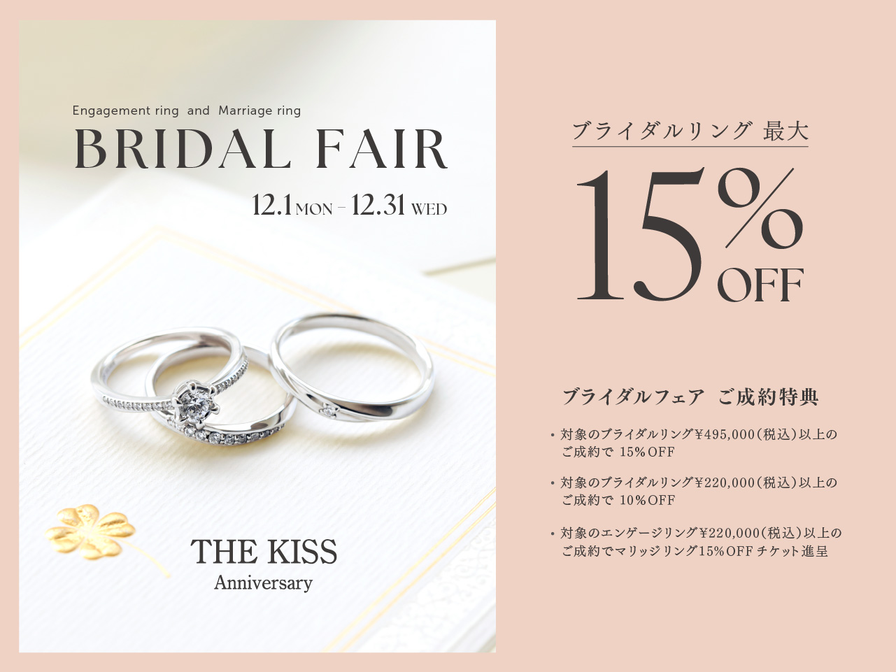 從 2025 年 12 月 1 日星期一至 2025 年 12 月 31 日星期三期間,我們將為購買THE KISS週年紀念婚戒的顧客提供特別優惠。