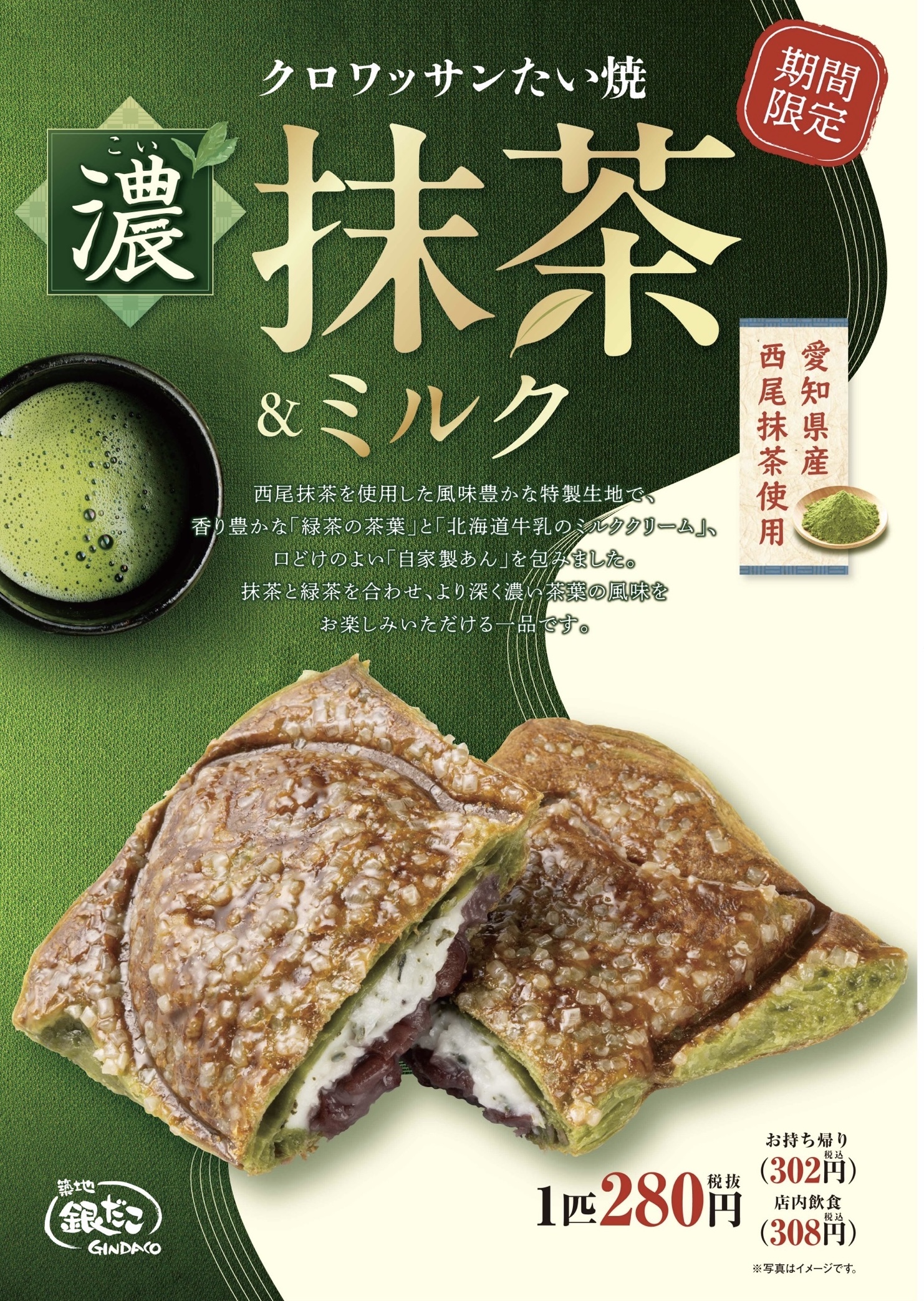 我們目前正在限時販售「抹茶鯛魚燒牛角包牛奶口味」!
