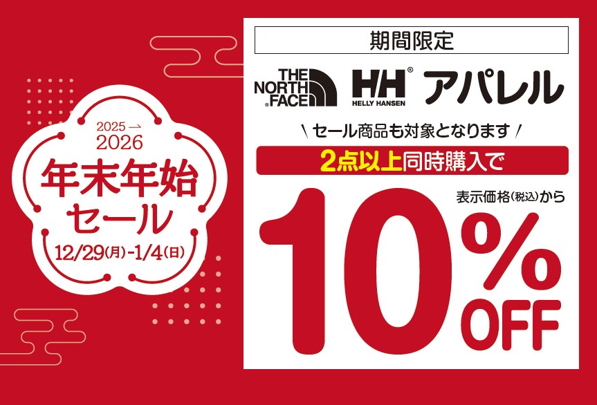 同時購買NORTH FACE・HELLY HANSEN服裝2件可優惠10%!