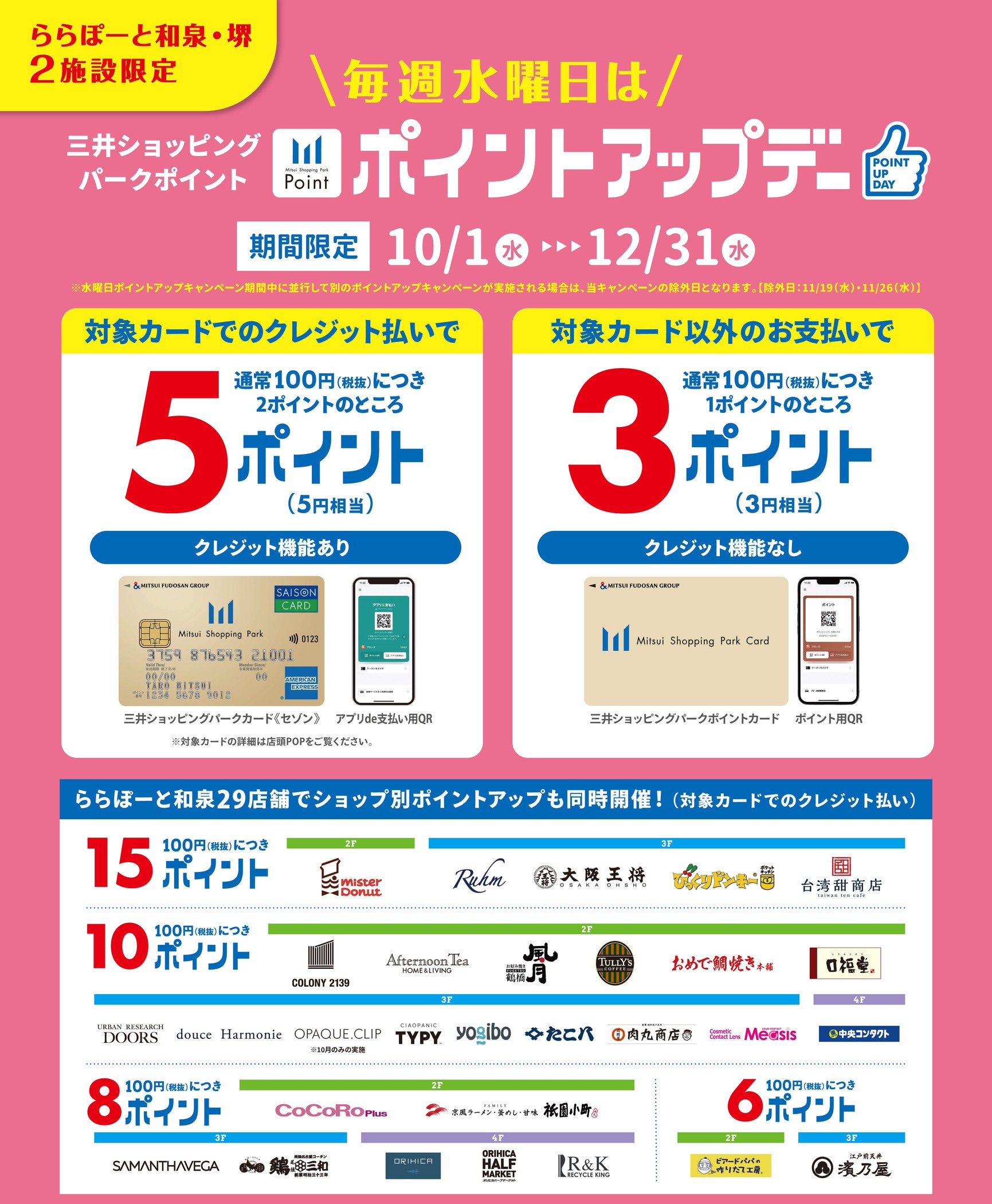 - <每週三>10月至12月也舉辦!LaLaport和泉三井購物公園Point Up Day!