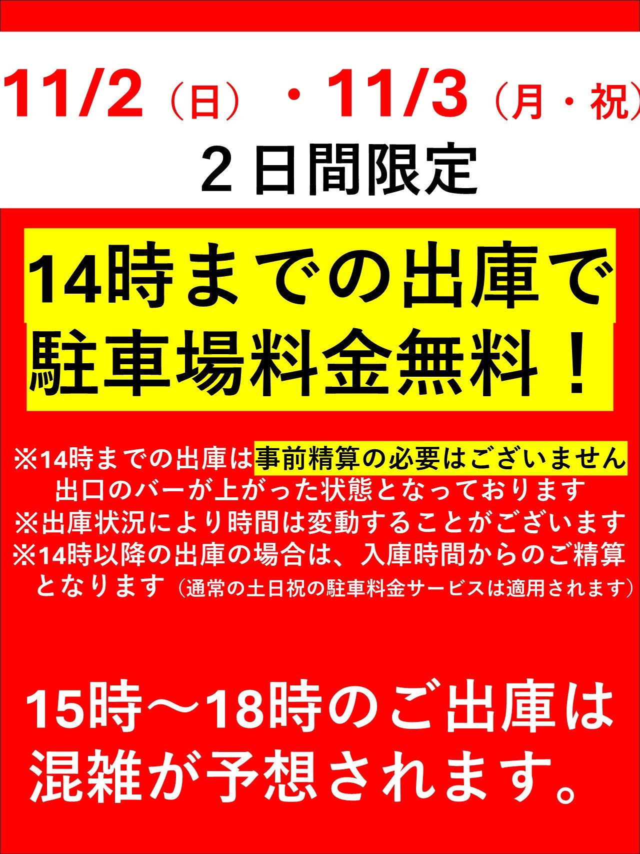 【僅限11月2日(週日)和3日(週一,假日)】下午2點前離開可免費停車費!
