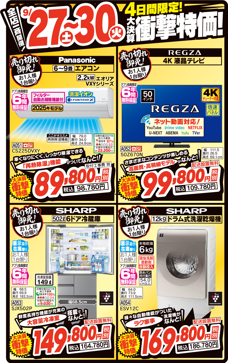 ☆9/27 (周六) ~9/30 (周二)限定4天空調・洗衣機・電視機超值大結算衝擊特價!