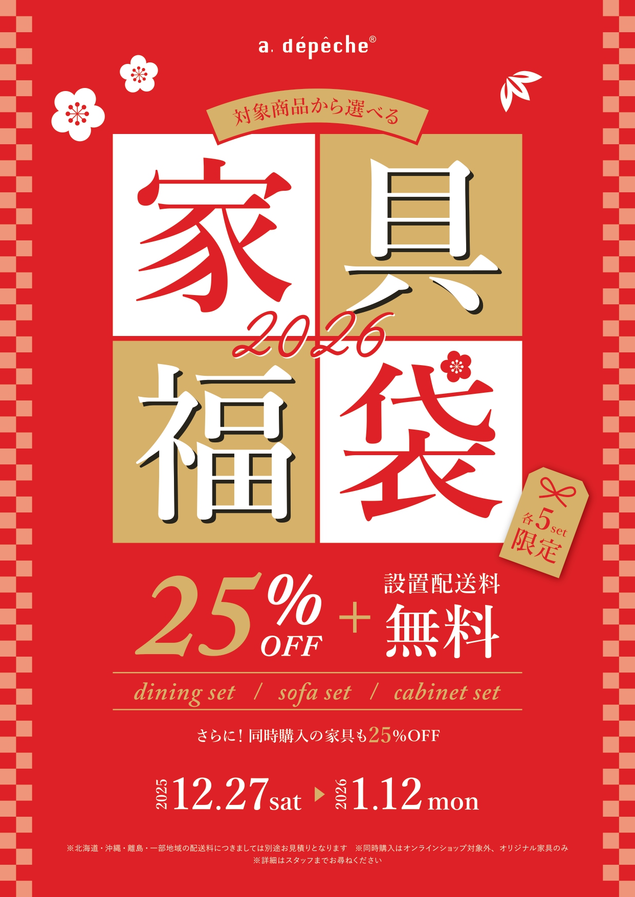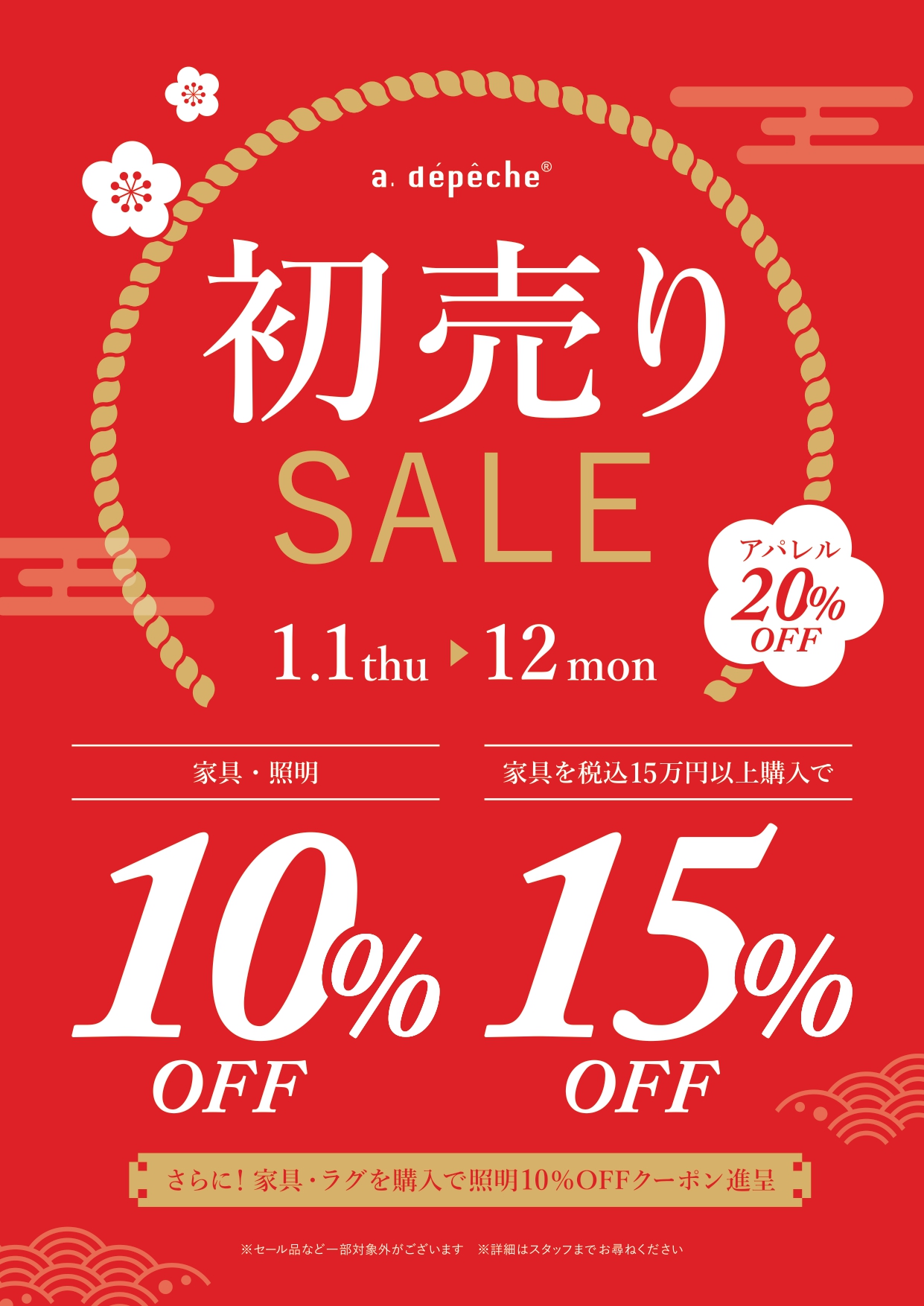 a.depeche新年促銷!所有家具和燈具九折!此外,購買價值 15 萬日圓(含稅)以上的家具,還可享有八五折優惠。