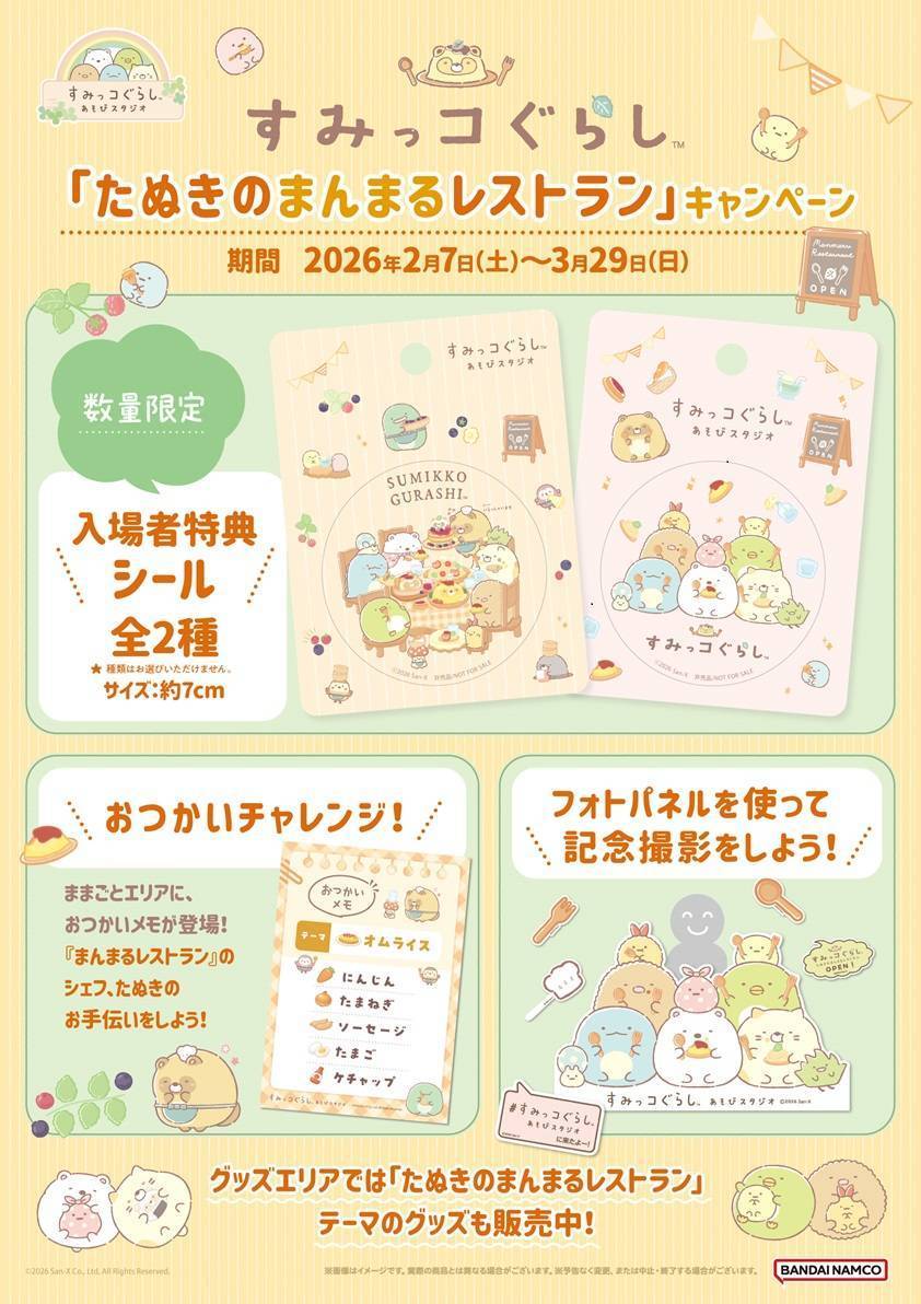 2月7日(土)~3月29日(日)の期間、すみっコぐらし新テーマ『たぬきのまんまるレストラン』に合わせたキャンペーンを開催します。