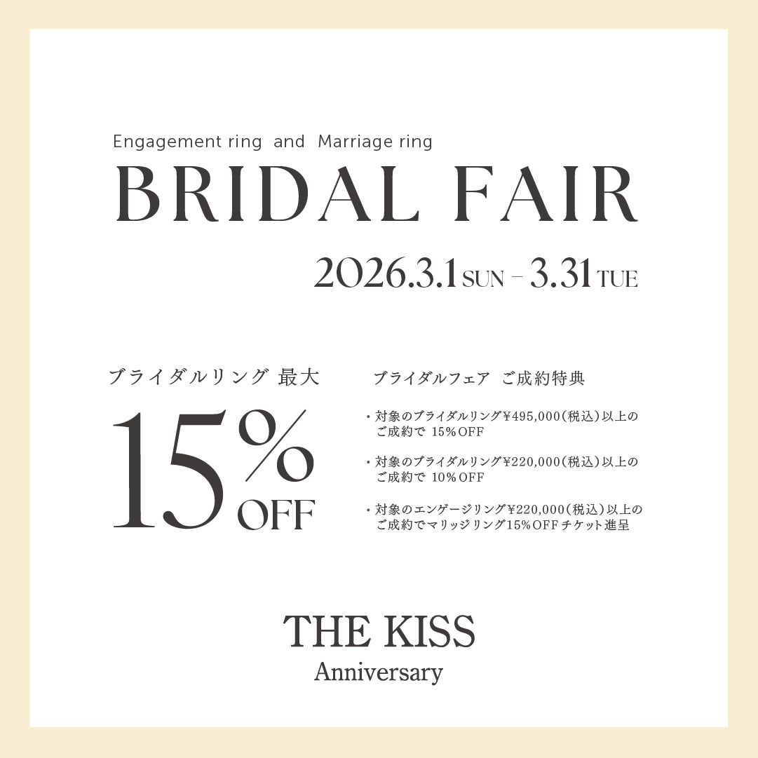 2026年3月1日(日)〜2026年3月31日(火)までの期間中、THE KISS Anniversaryのブライダルリングをご成約のお客さまに、お得な特典をご用意しております。