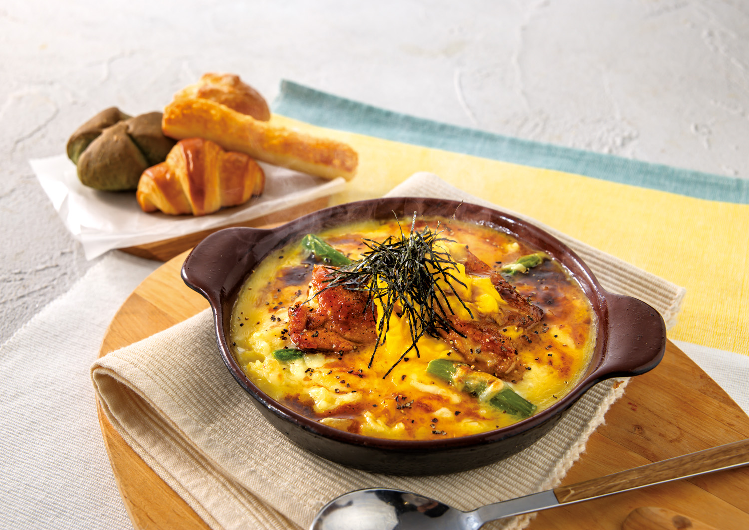 ●照燒雞肉和蘆筍黏糊糊的雞蛋乳酪培根意面附面包無限暢食1,790日元 (含稅1,969日元)
