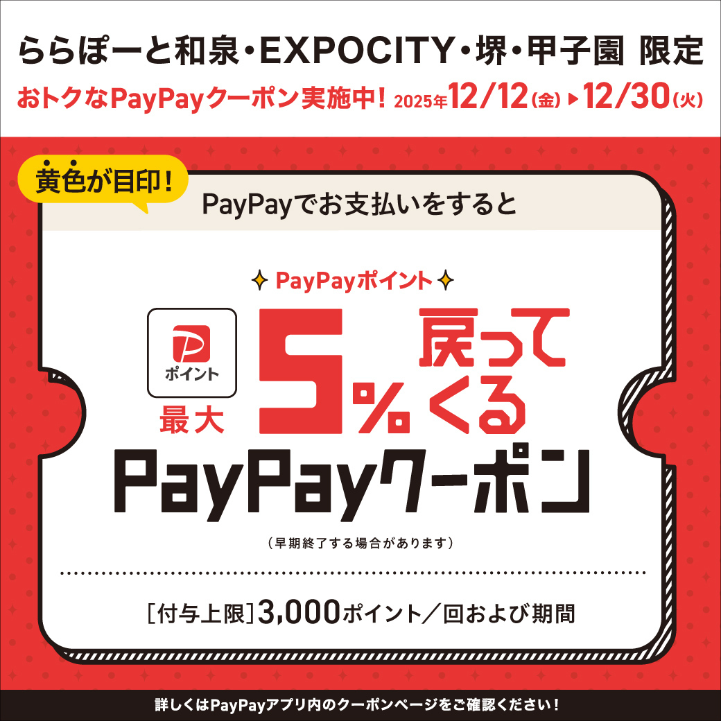 - 使用PayPay支付時,PayPay積分最多可返還5%的優惠券