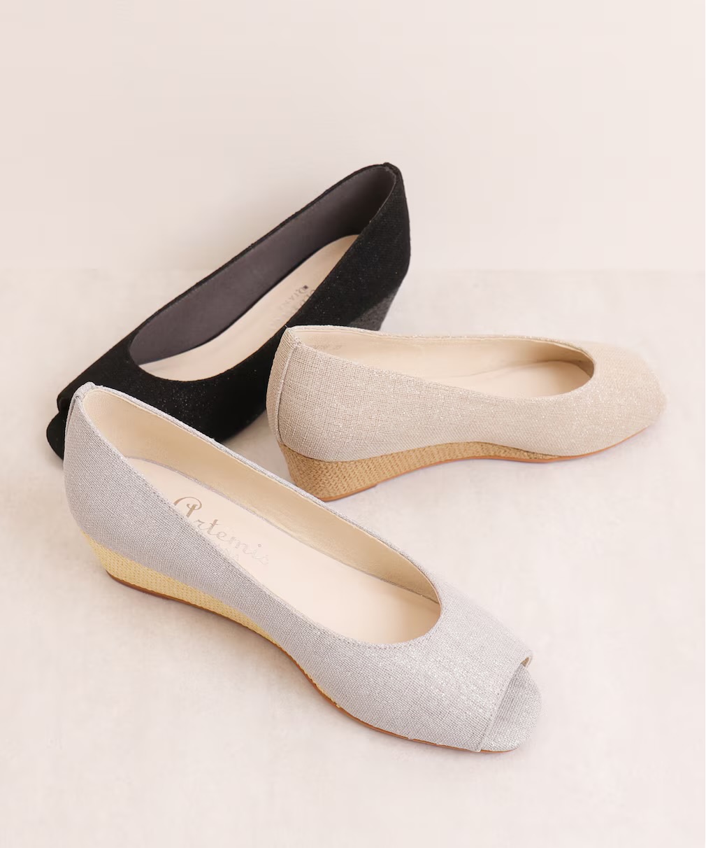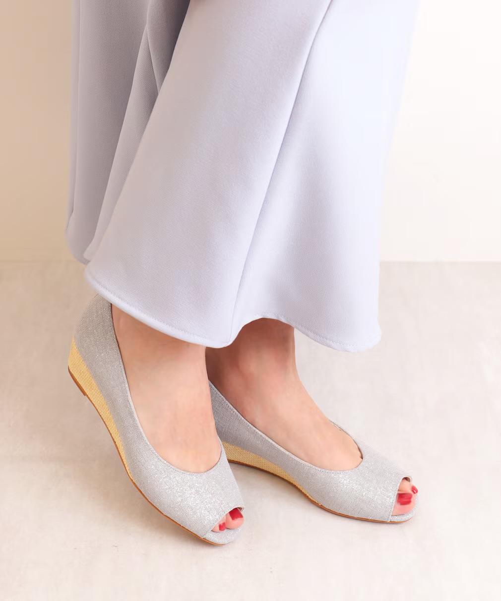 這款坡跟鞋採用布料覆以細閃粉,每走一步都閃耀著優雅的光芒。