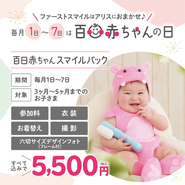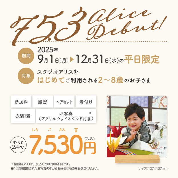 Studio Alice幫助家庭永久保存他們自己的慶祝活動和特殊場合的生動記憶,包括兒童參拜神社、百日和七五三等傳統慶祝活動的紀念照片拍攝,以及孕婦照、生日照、幼兒園和學校入學照、慶祝 10 歲的半成人儀式和 20 歲的成人儀式。