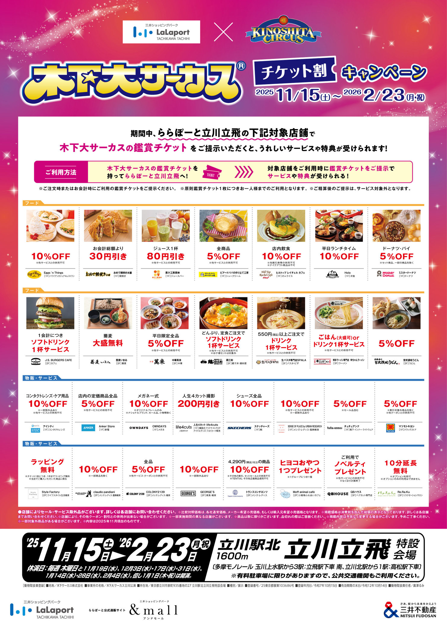 活動期間,如果您在LaLaport立川立飛店出示您的木下馬戲團入場券,即可享受服務和優惠!