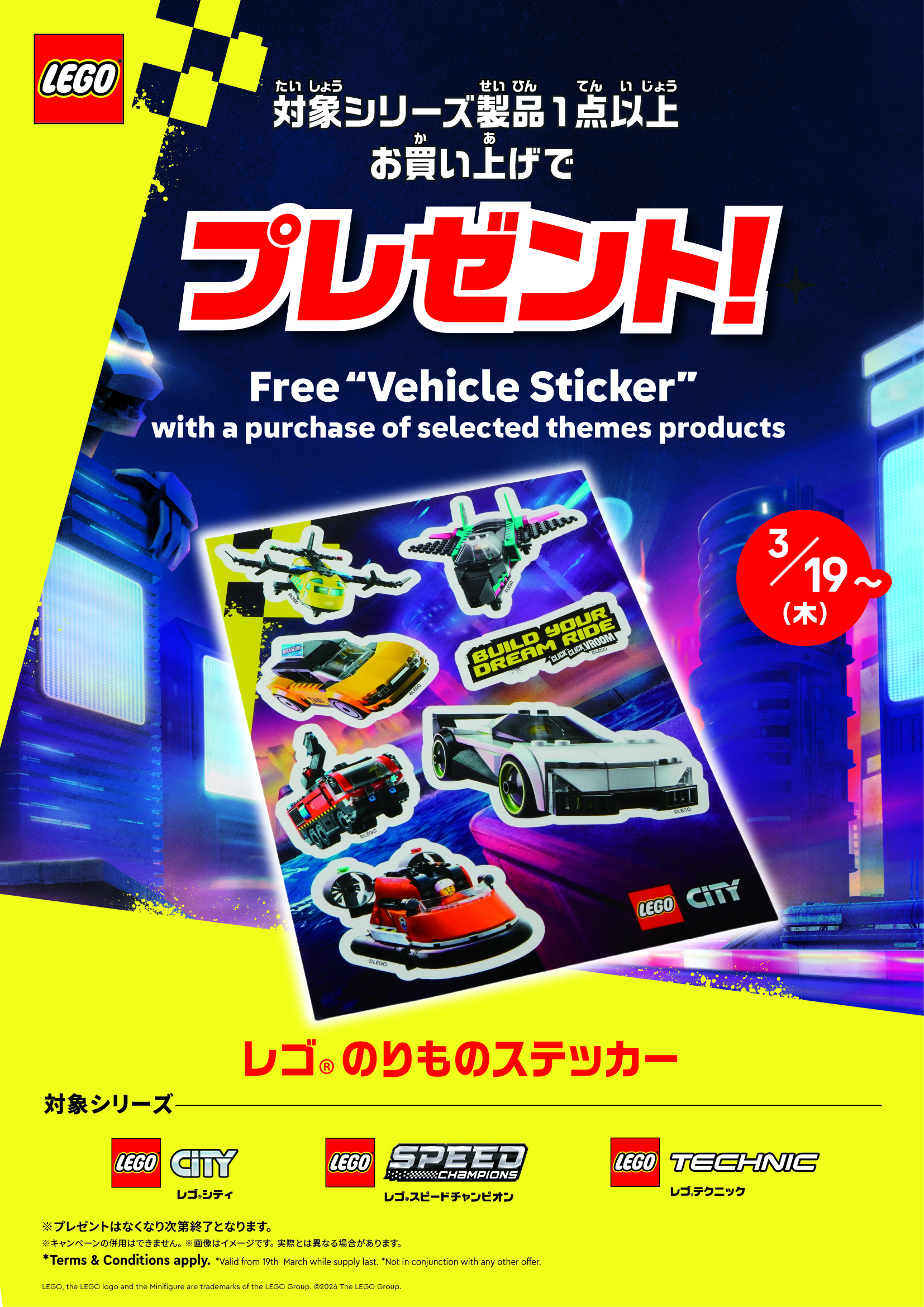 從 3 月 19 日(星期四)起,在店內購買任何符合條件的 LEGO® 系列產品,即可獲贈一張免費的 LEGO® 車輛貼紙!