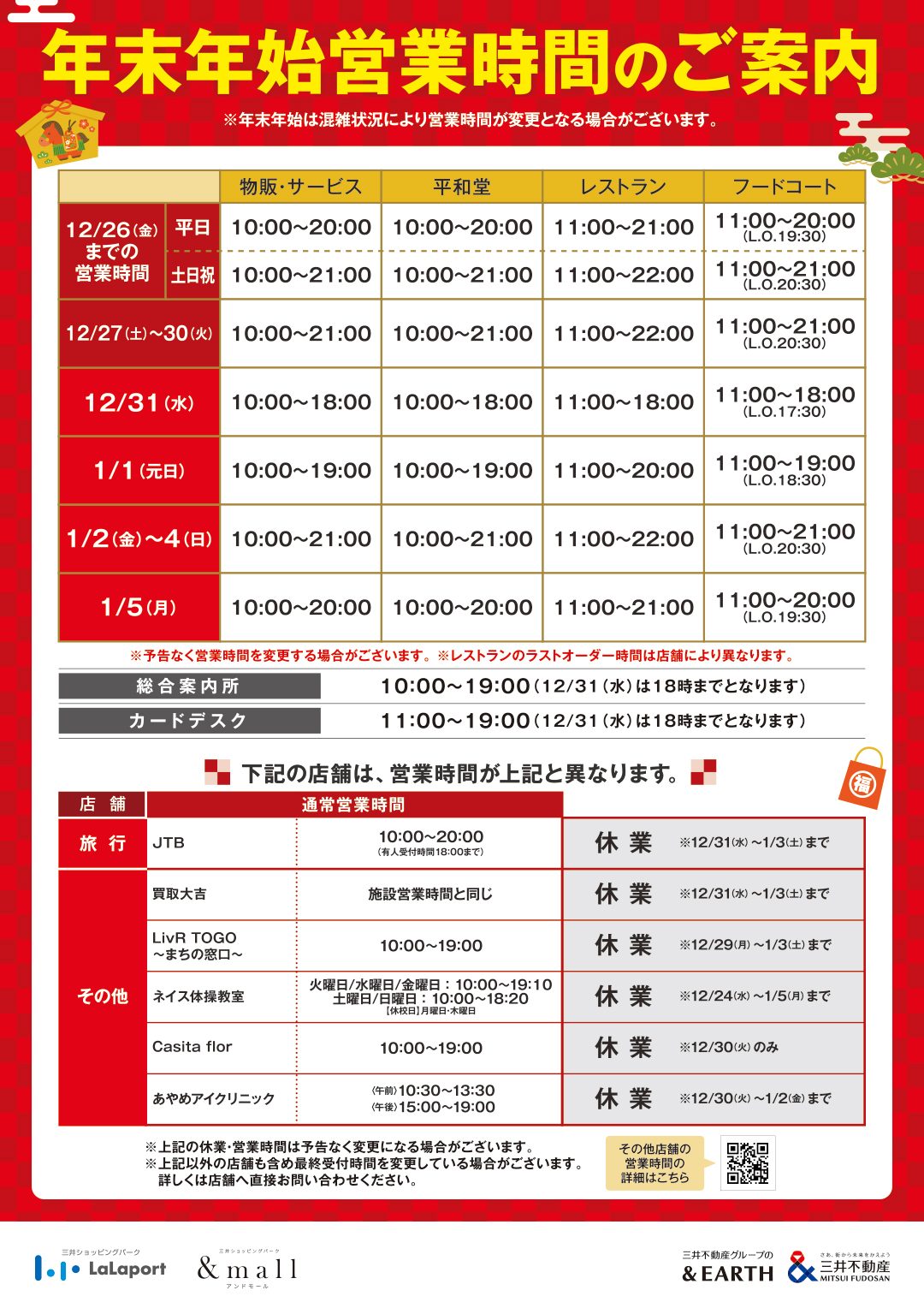 ■ JTB …12月31日(星期三)至1月3日(星期六)期間暫停營業