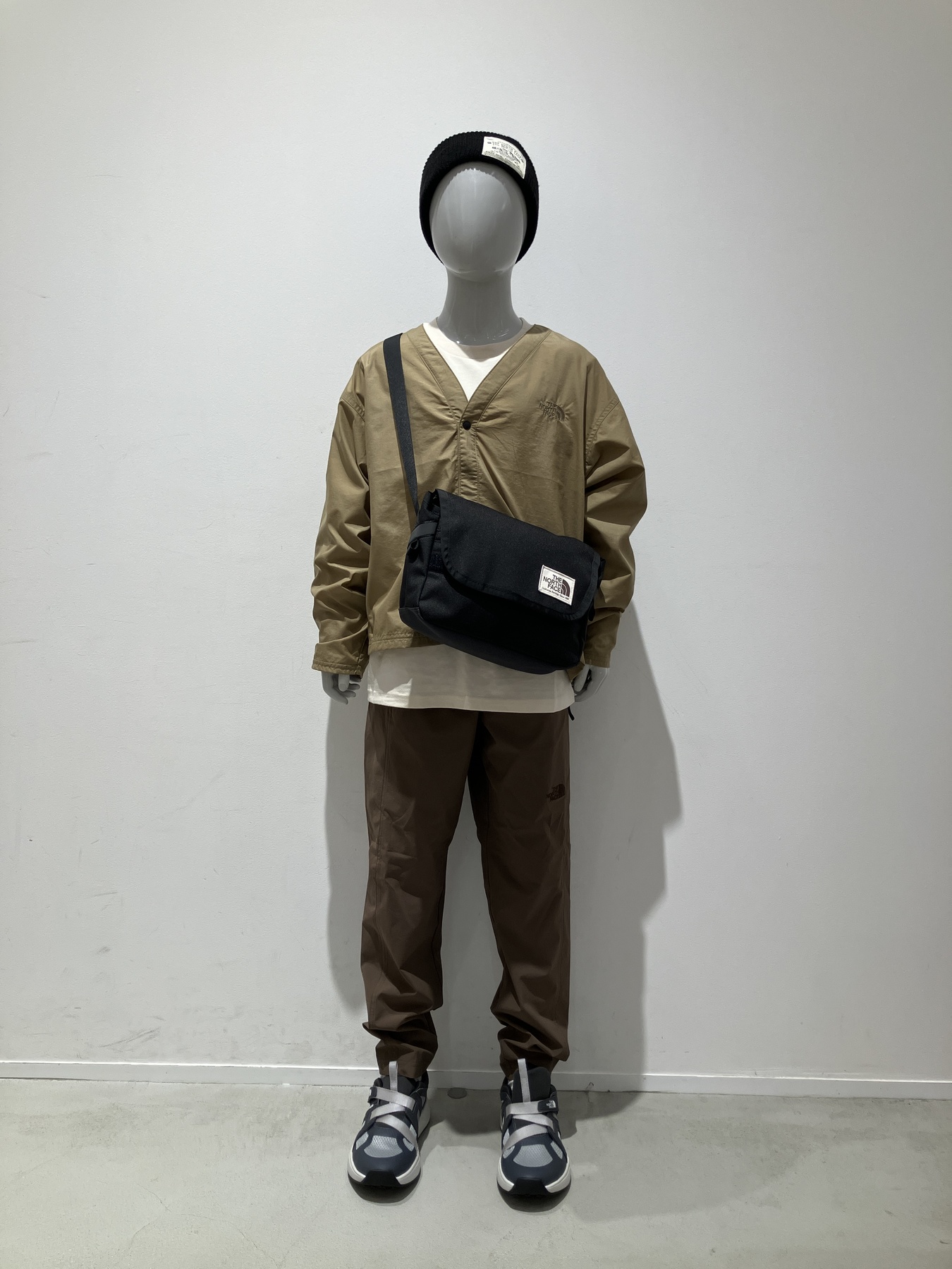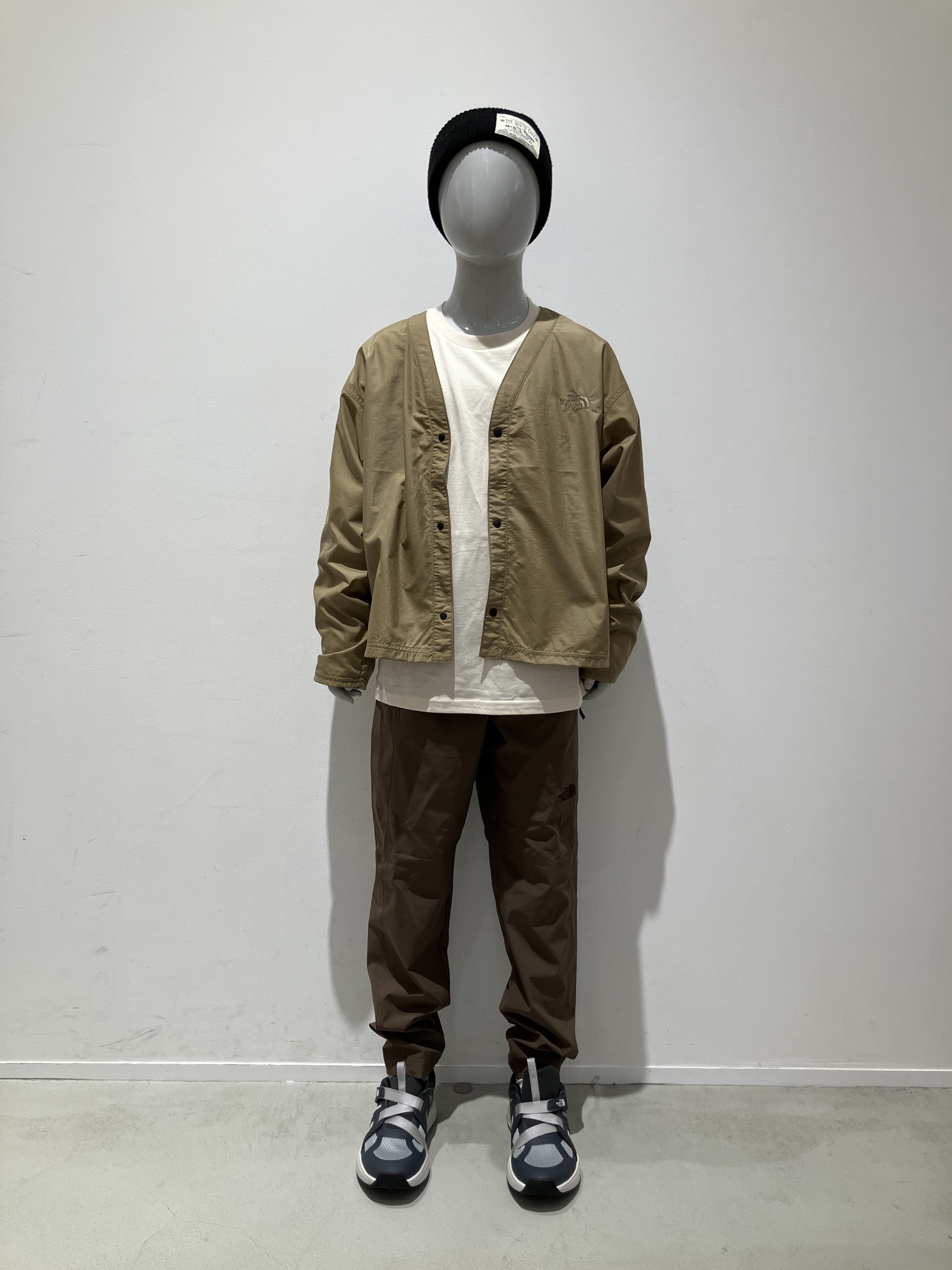 小巧的米色開襟衫搭配棕色褲子,營造出統一、柔和色調的休閒風格。