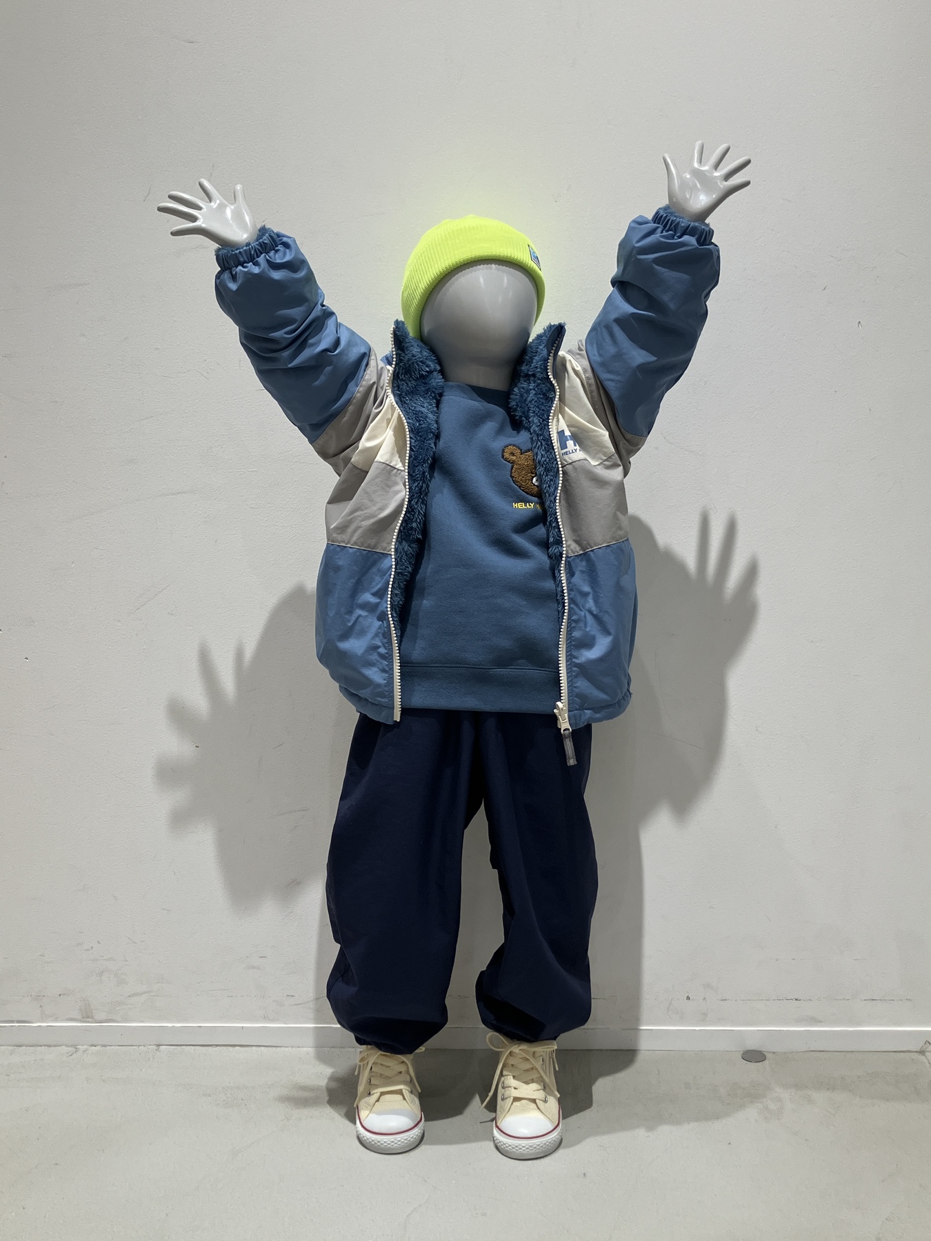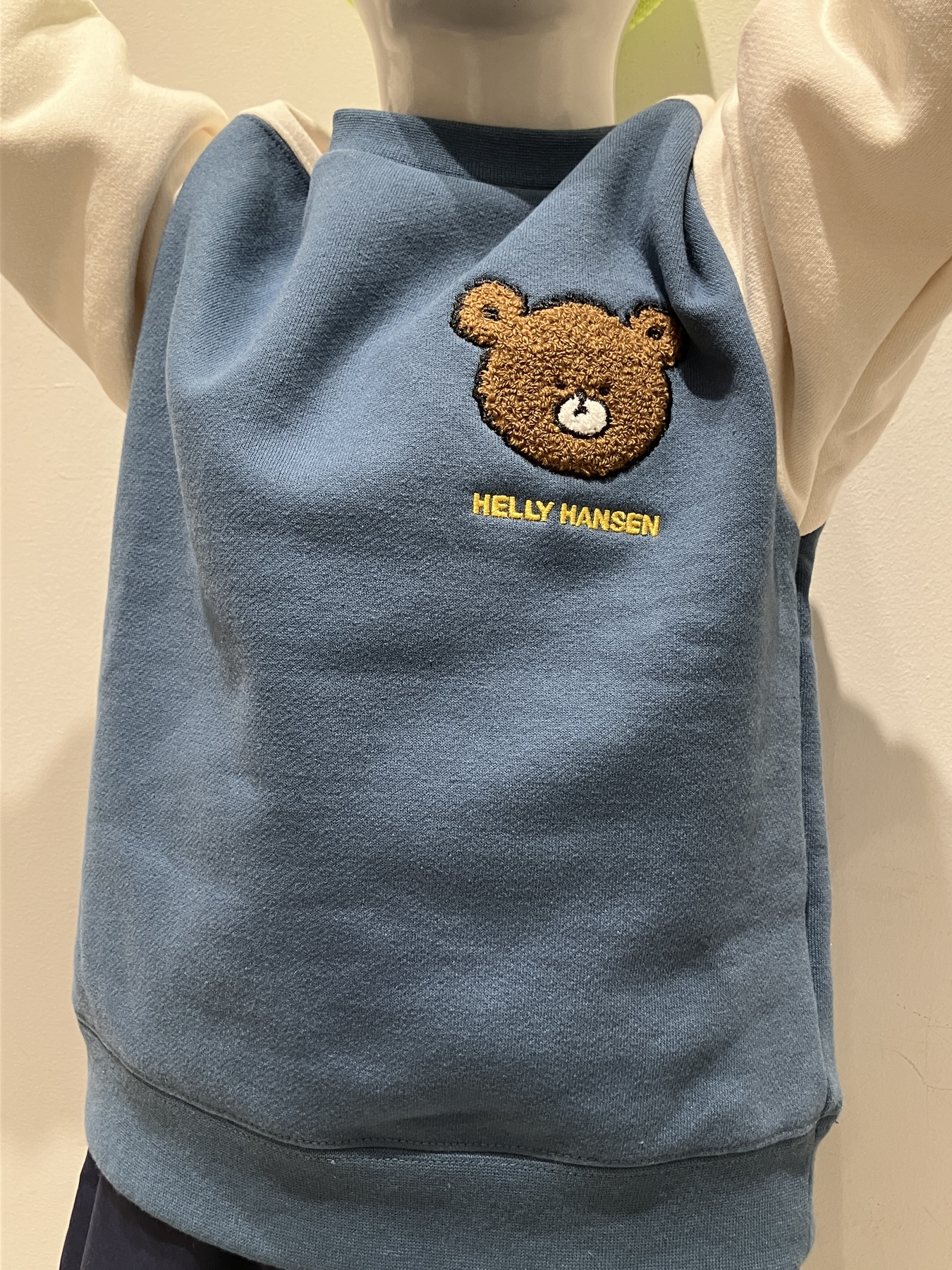 內搭一件帶有 Helly Bear 圖案的可愛衛衣,打造出當季的秋冬季造型。