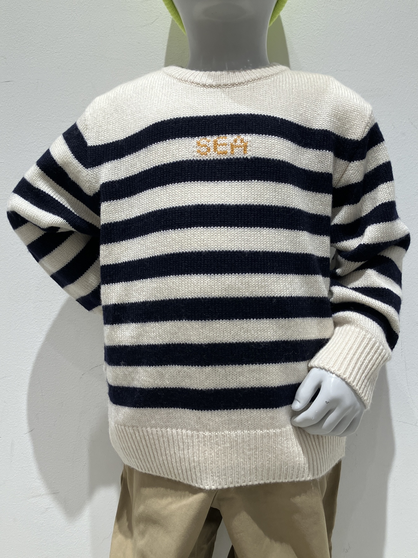 內搭條紋針織衫與斜紋棉佈褲,簡單中展現高雅的海洋風造型。