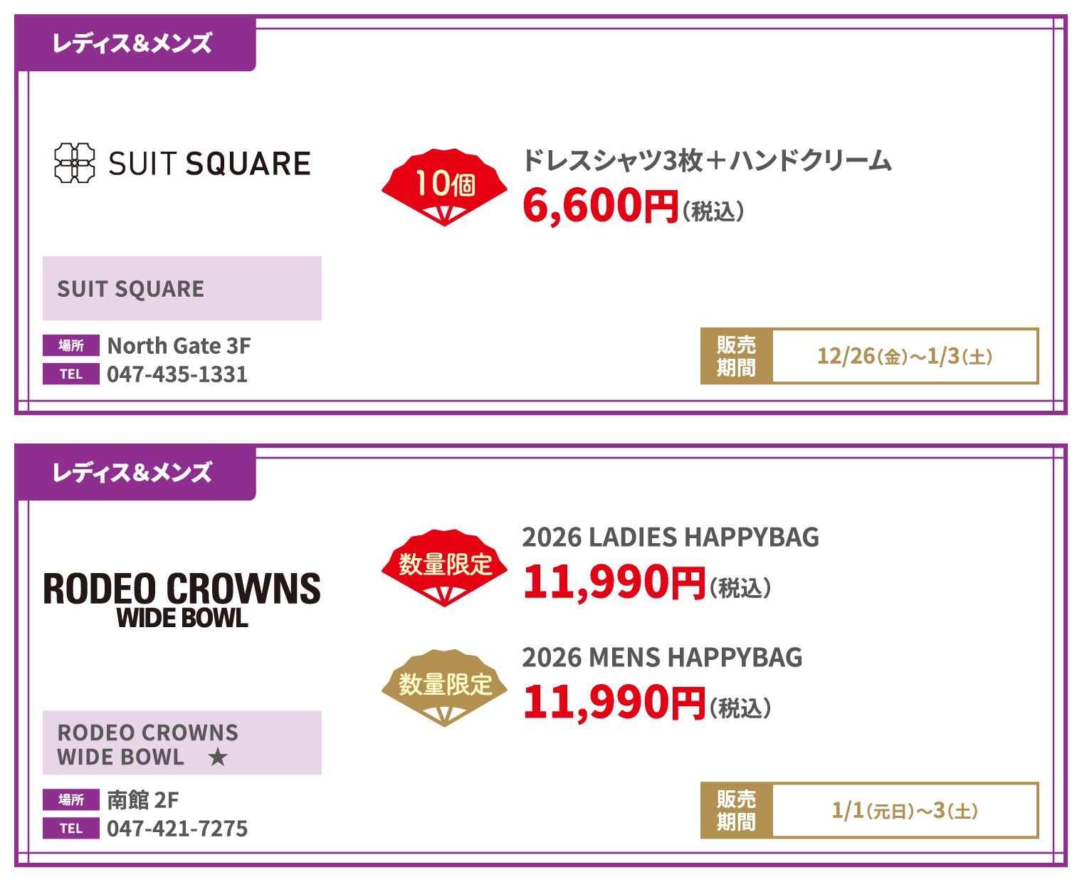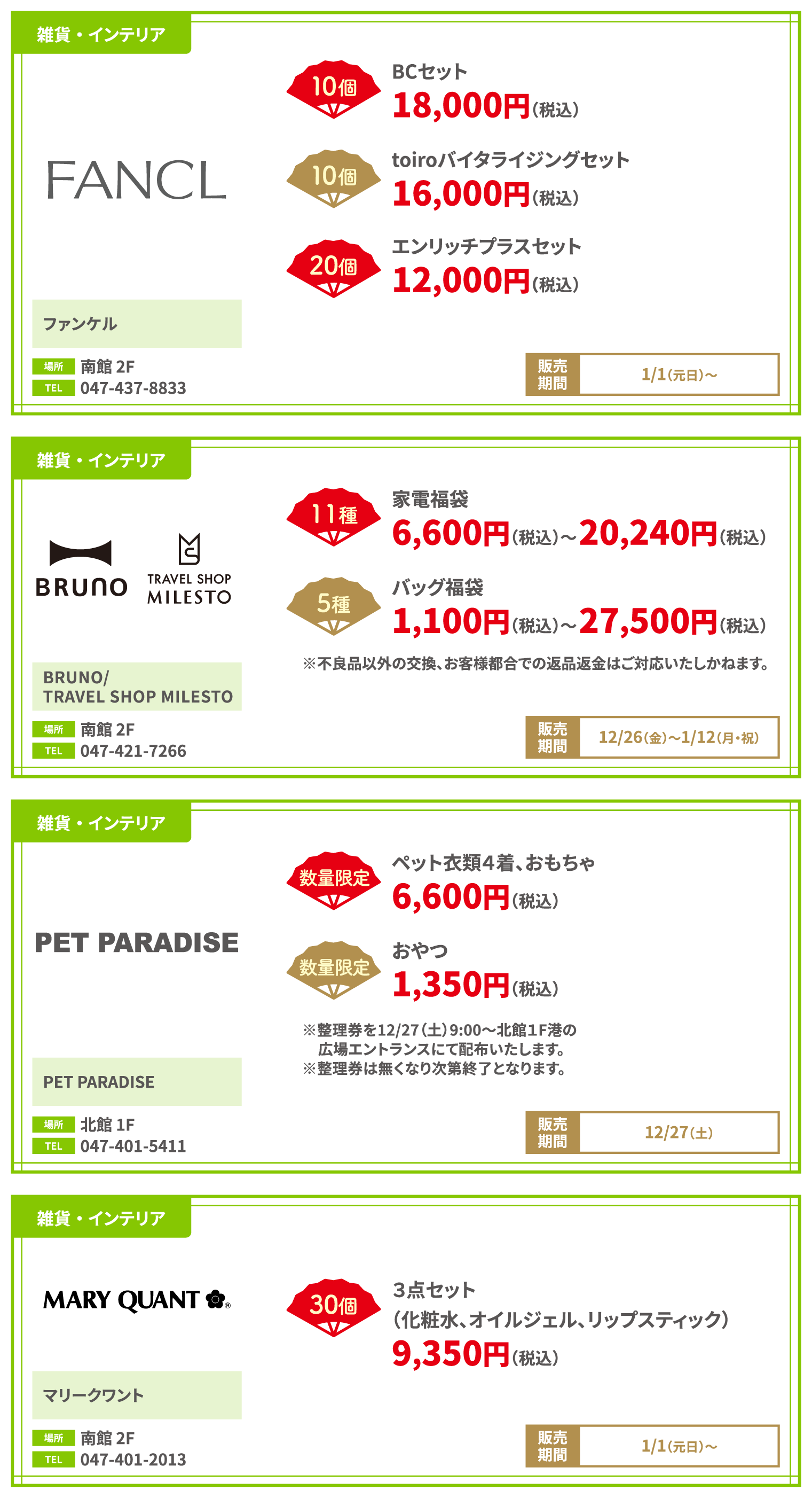 ●福袋の販売数、価格は変更となる場合がございます。●掲載店舗以外でも販売しております。 ●福袋についての詳細等は店舗により異なります。詳しくは、各店舗までお問い合わせください。