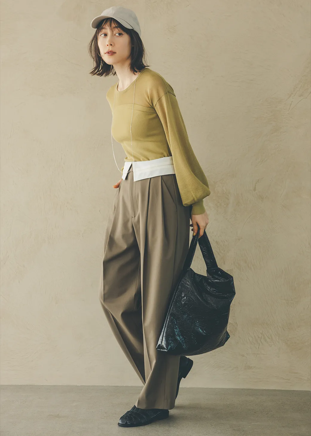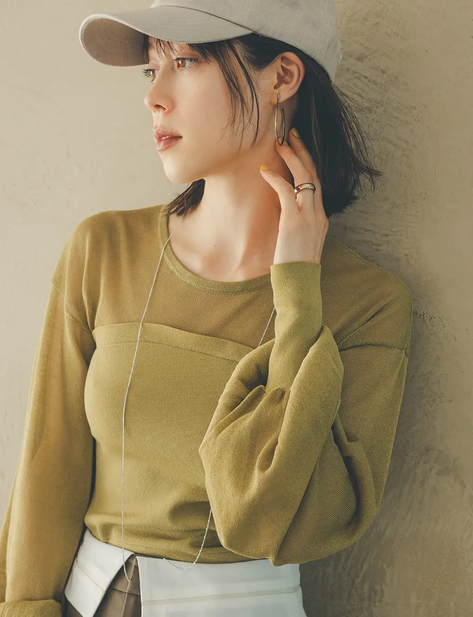 透ける部分と透けない部分をヨーク部分で切り替えたニット。「透ける服はトレンドだけに、色々なところで出会ってしまい、選択肢がたくさん。このニットは、デコルテから袖にかけての部分のみがシアーで、身頃は透けない編み方なので、露出が高くなりすぎず大人も堂々と着られます」。カマー風パンツやキャップなどメンズライクなアイテムも、ほのかな肌見せ感で、今っぽくて軽やかなスタイルに。