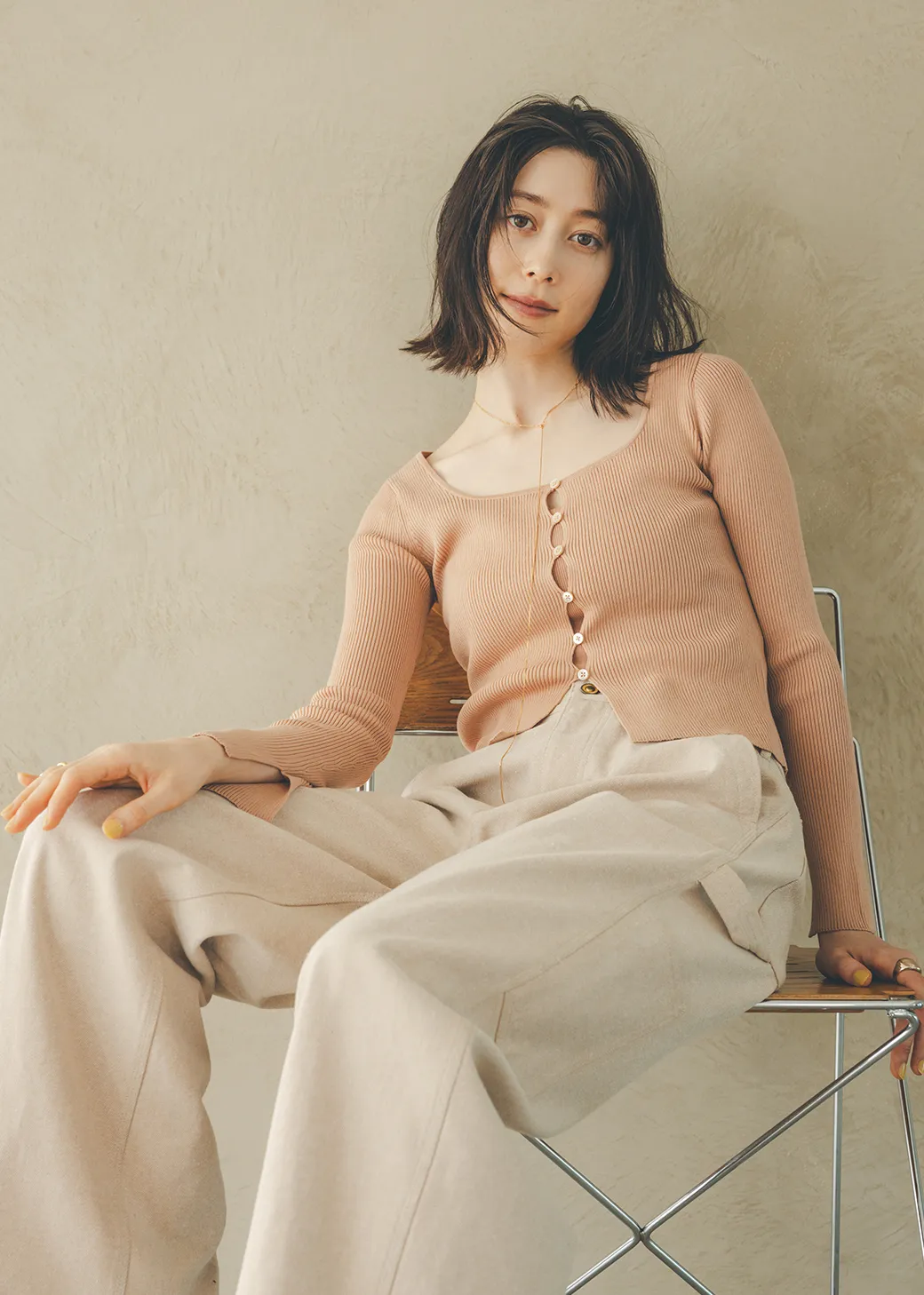 「ピタッとしたニットなので、セクシーになりすぎないようボーイズライクなペインターパンツを合わせてバランスをとりました。肌なじみがいい色だから、肌見せも優しい雰囲気に」。デコルテをすっきり美しく見せるスクエアネックのニットをピックアップ。フロントボタンに隙間ができるデザインなので下に同色のインナーを重ねたり、カーディガンとして前開きで着たりとアレンジを楽しんでも。