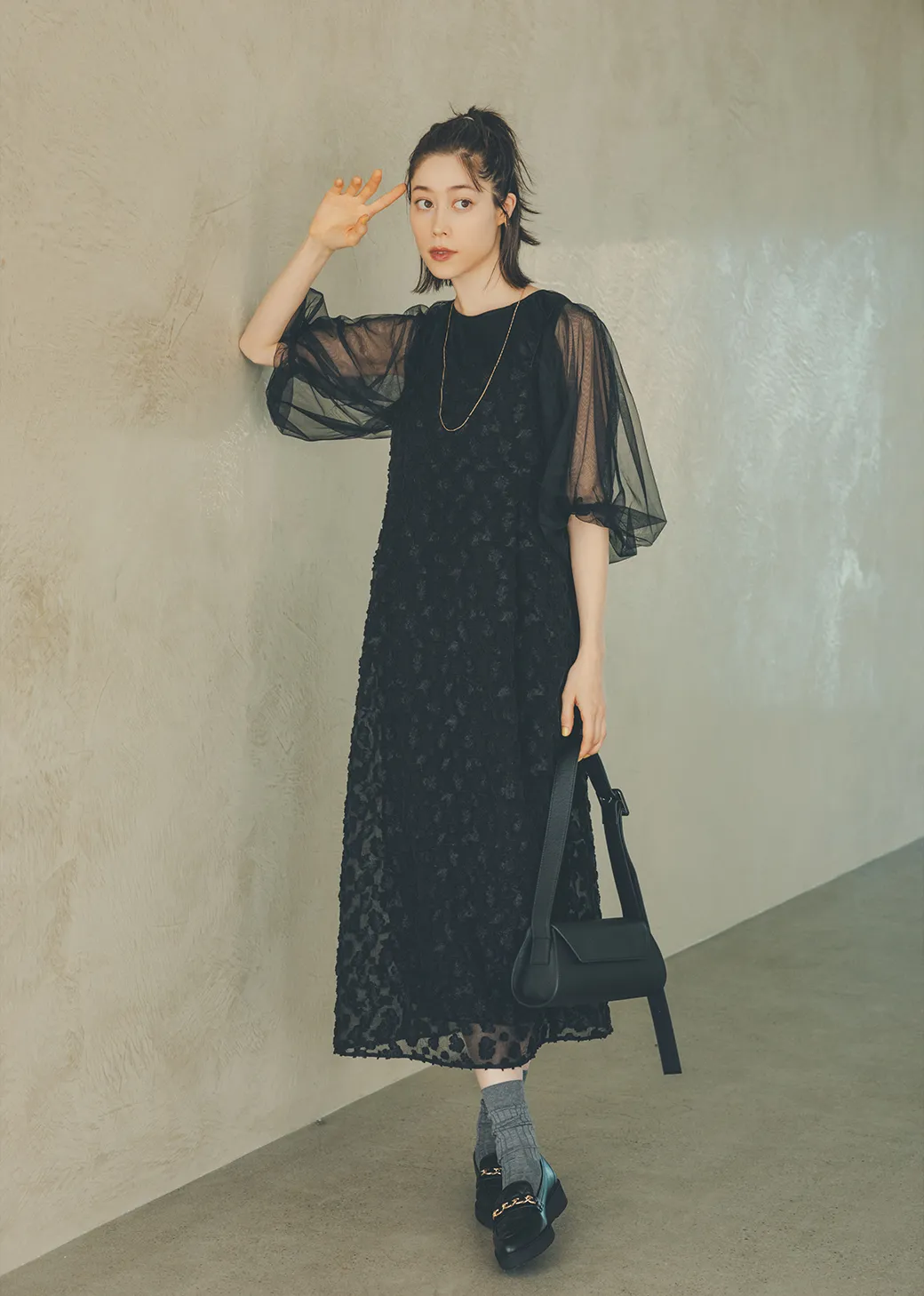肌見せ服初心者は、まずシックな黒からスタートするのが正攻法。「1枚だと透け度の高いシアーブラウスの上に、透け感のあるレースのワンピースをレイヤードして肌見せ感をコントロール。透ける服同士の重なり合いで、繊細なニュアンスが生まれます」。それぞれドレスアップにも対応できそうなブラウスとワンピースですが、重ね着やソックス合わせなどでカジュアルダウンした着こなしも素敵。