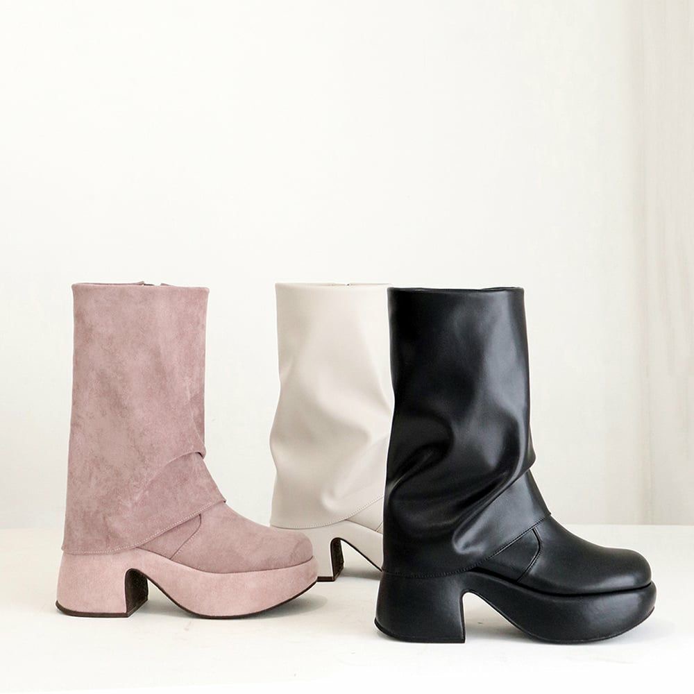 這款厚底靴採用與Ashinaga Ojisan熱門厚底高跟鞋相同的鞋底,完美展現了品牌的標誌性風格。飽滿的silhouette搭配尖頭「額頭」設計,賦予其獨一無二的個性。時尚的包覆式設計,讓這款靴子輕鬆駕馭各種場合。