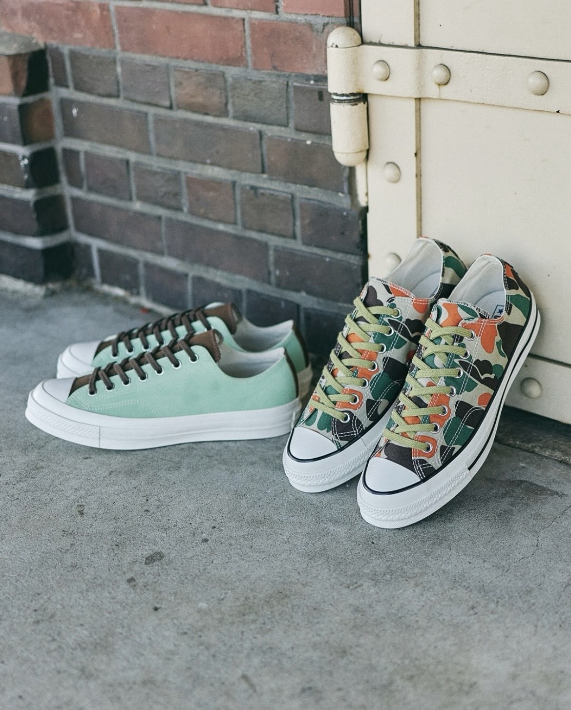 這款麂皮鞋以匡威1983年推出的「83迷彩」鞋款為原型,採用原創迷彩圖案,並以橙色點綴,搭配巧克力薄荷色的圖案。鞋幫包邊採用統一的白色,營造出簡約乾淨的視覺效果。