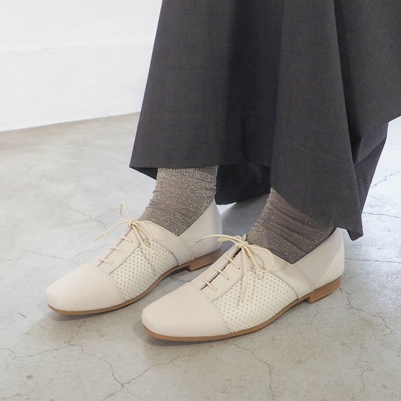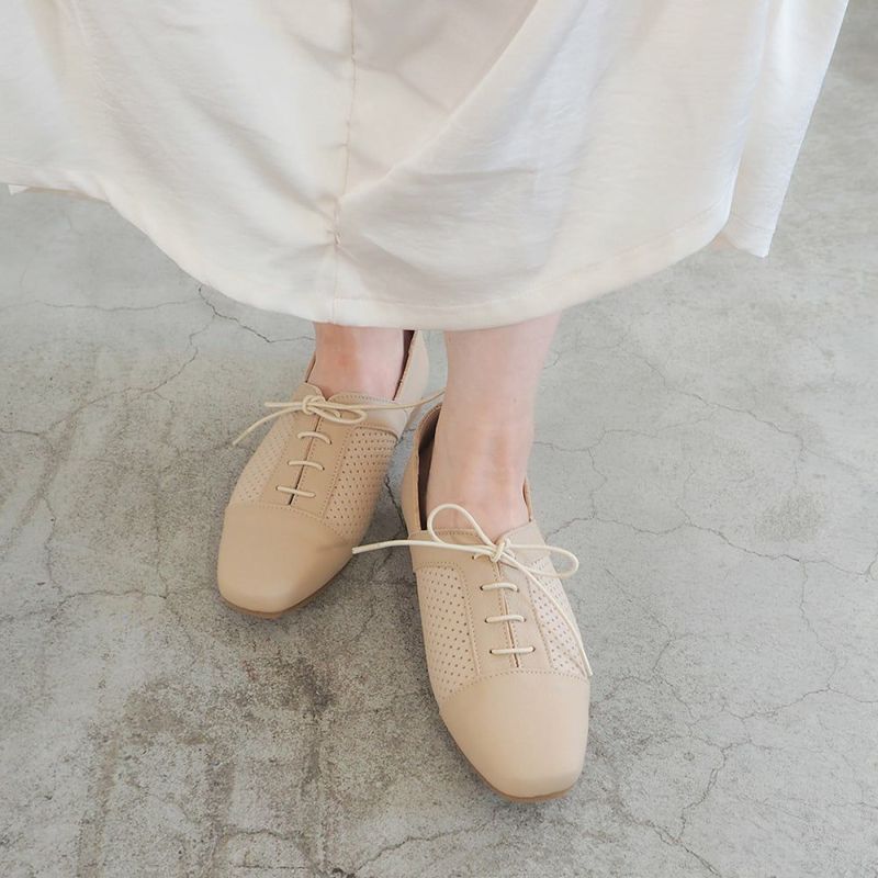 這款繫帶鞋採用網狀壓花皮革製成,觸感自然柔軟。中性色調既不顯得過於休閒,又能輕鬆搭配輕盈的春季服飾。
