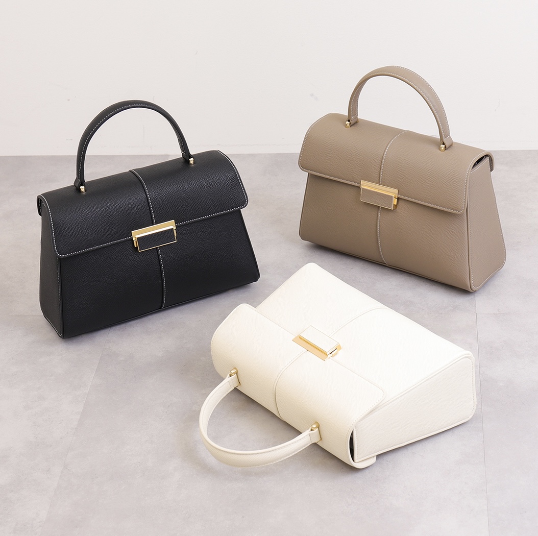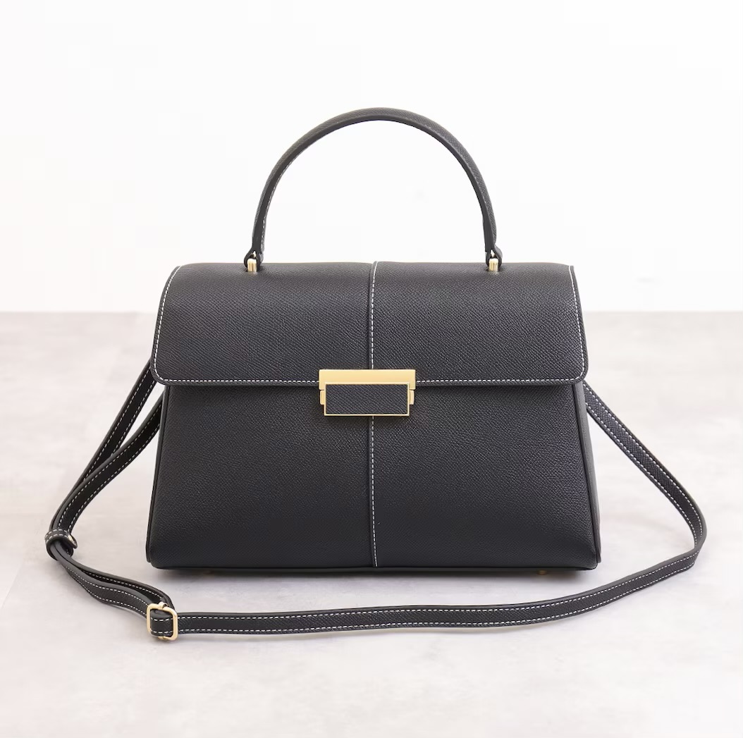 一款精緻優雅的手提包,飾有白色縫線。