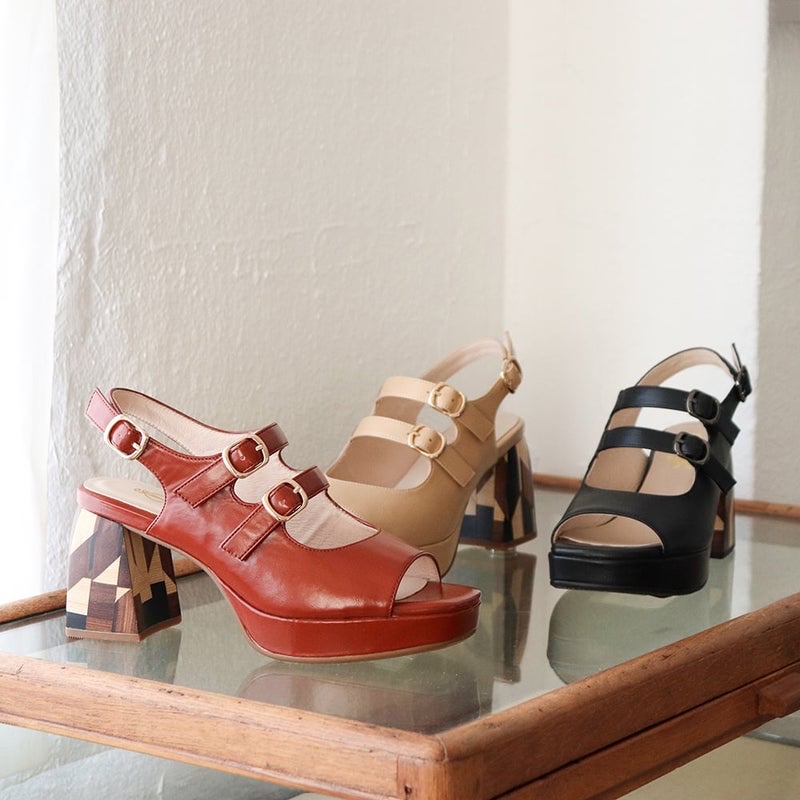 幾何学柄のスタックヒールが目を惹く、厚底バックスリングサンダル。