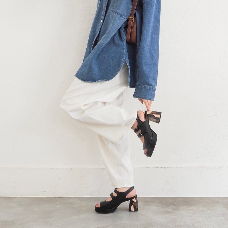 個性的なヒールデザインを主役にするために、アッパーはあえてシンプルに仕上げました。サイドが深く、足全体を優しく包み込むカバードデザインは、シンプルな中にも程よいボリューム感があり、夏のコーディネートのアクセントにぴったり。ソックスとも相性が良く、夏から秋にかけて長く活躍してくれる一足です。