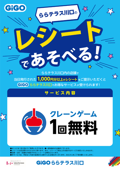 ★館内店舗のレシート提示でGiGOクレーンゲーム1回サービス★