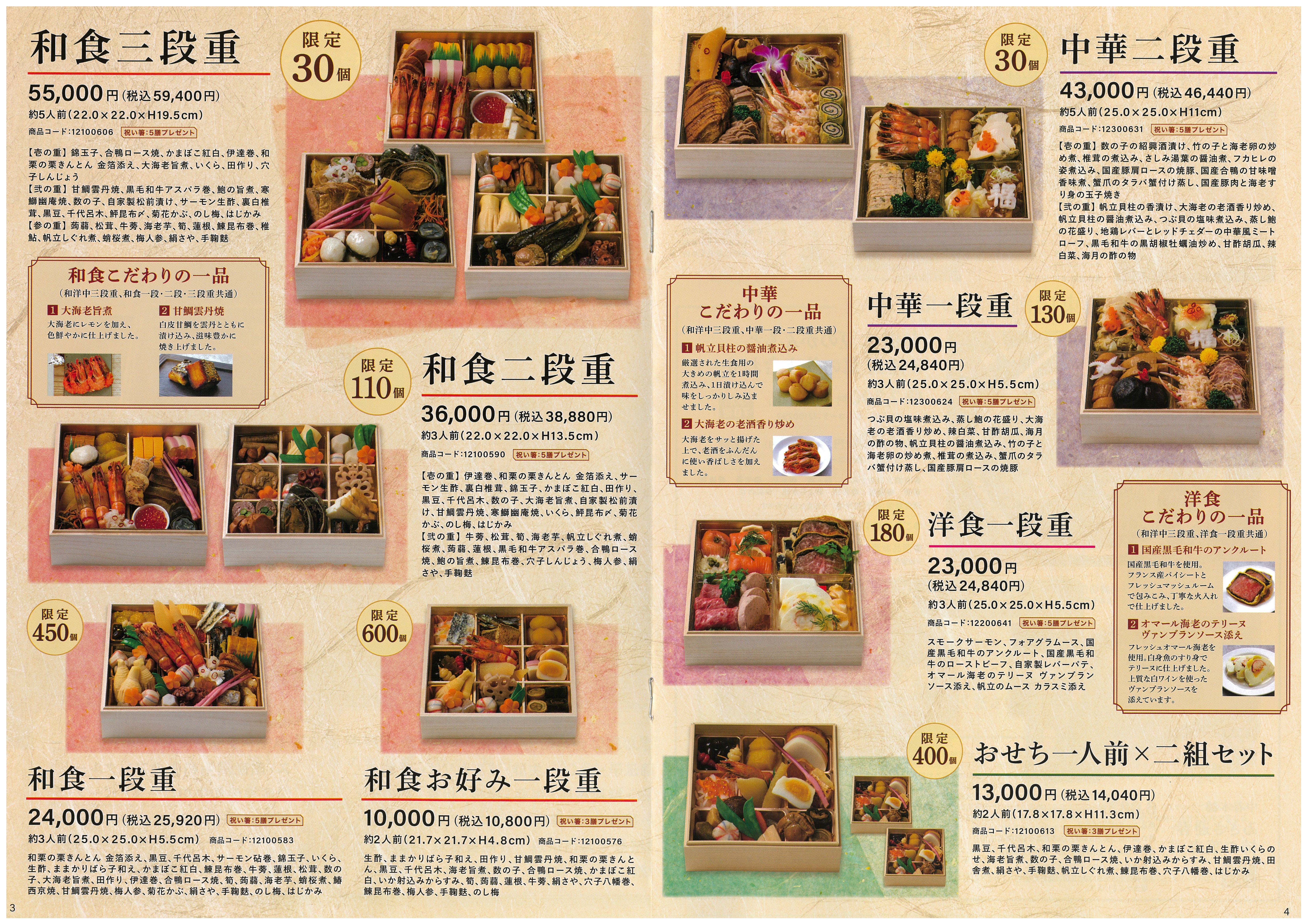 栗子金團(金箔裝飾)、黑豆、千代木、鮭魚絹豆、錦蛋、鮭魚籽