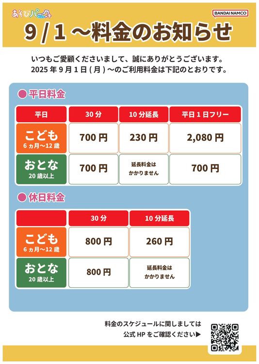 兒童(6個月~12歲):700日圓(含稅),30分鐘以內