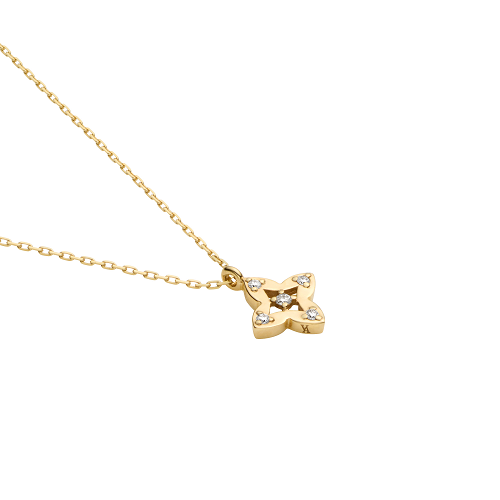 一條鑽石項鍊,silhouette為柔和的四瓣花,並飾有精緻的鏤空圖案。