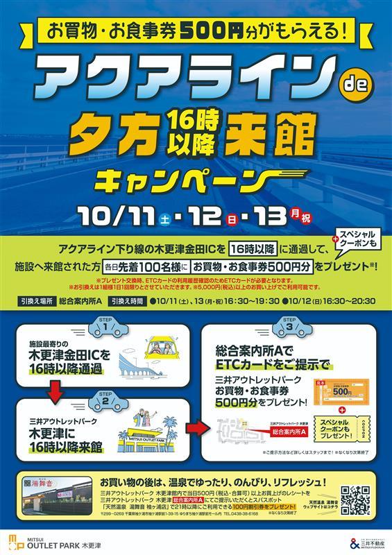 凡於適用當日 16:00 後,搭乘 Aqua-Line off-road,途經木更津Kanada IC,並參觀MITSUI OUTLET PARK木更津