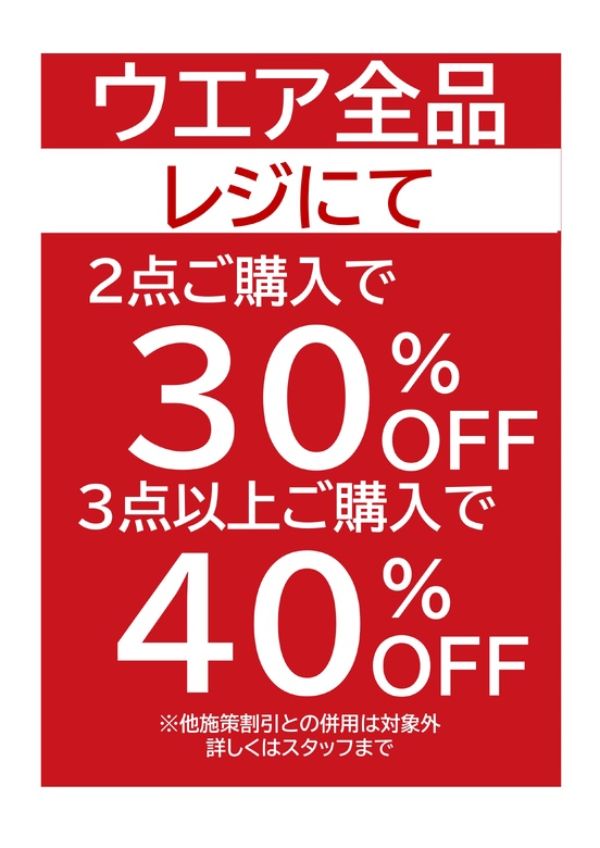 購買衣服2件立減30%,購買3件以上立減40%