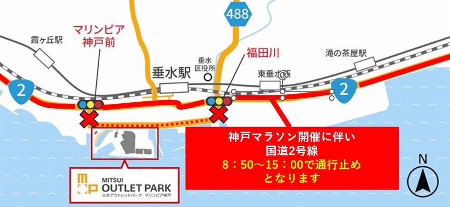 當天,國道2號線和瑪林匹亞神戶前的道路8:50 至 15:00 道路封閉這將是。