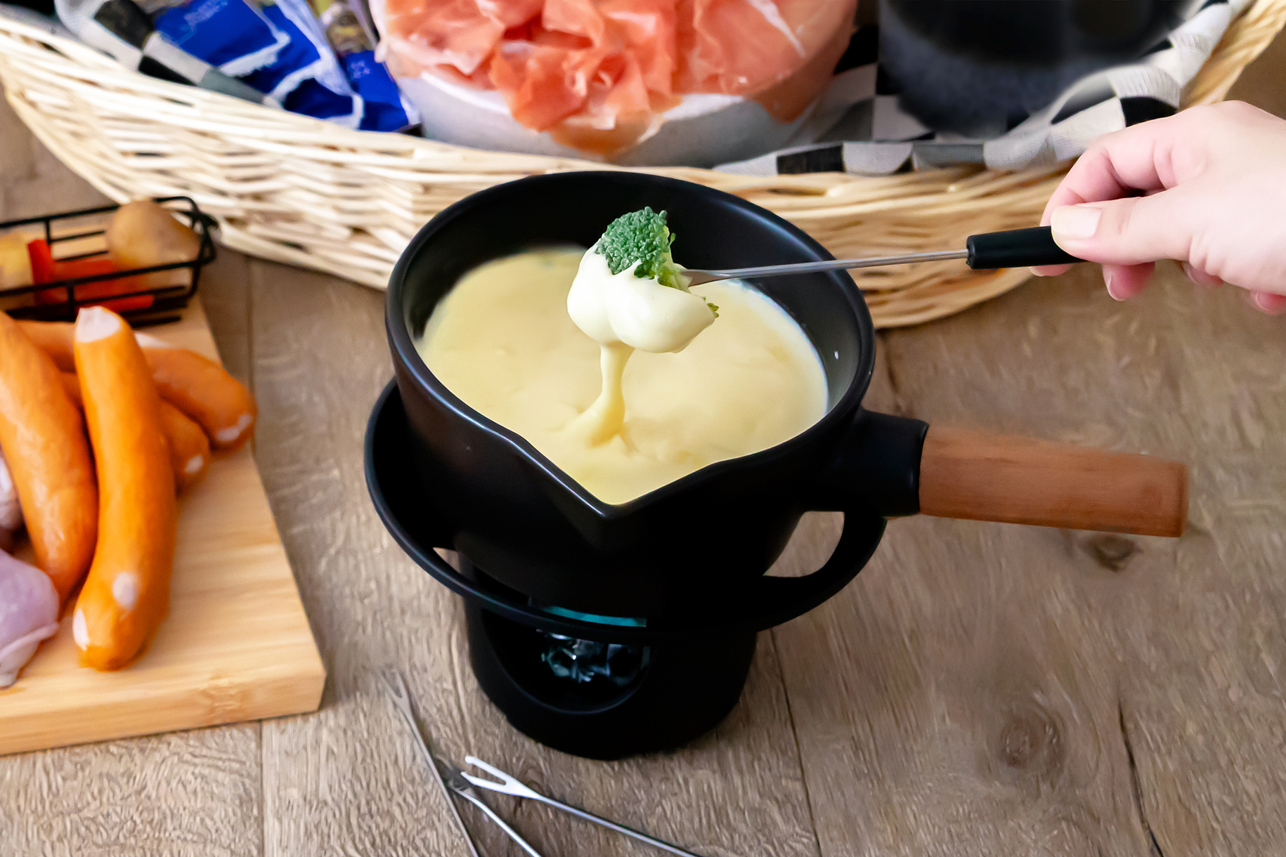 將燒烤架上烤製的熱騰騰的食物蘸上融化的起司火鍋,盡情享用。