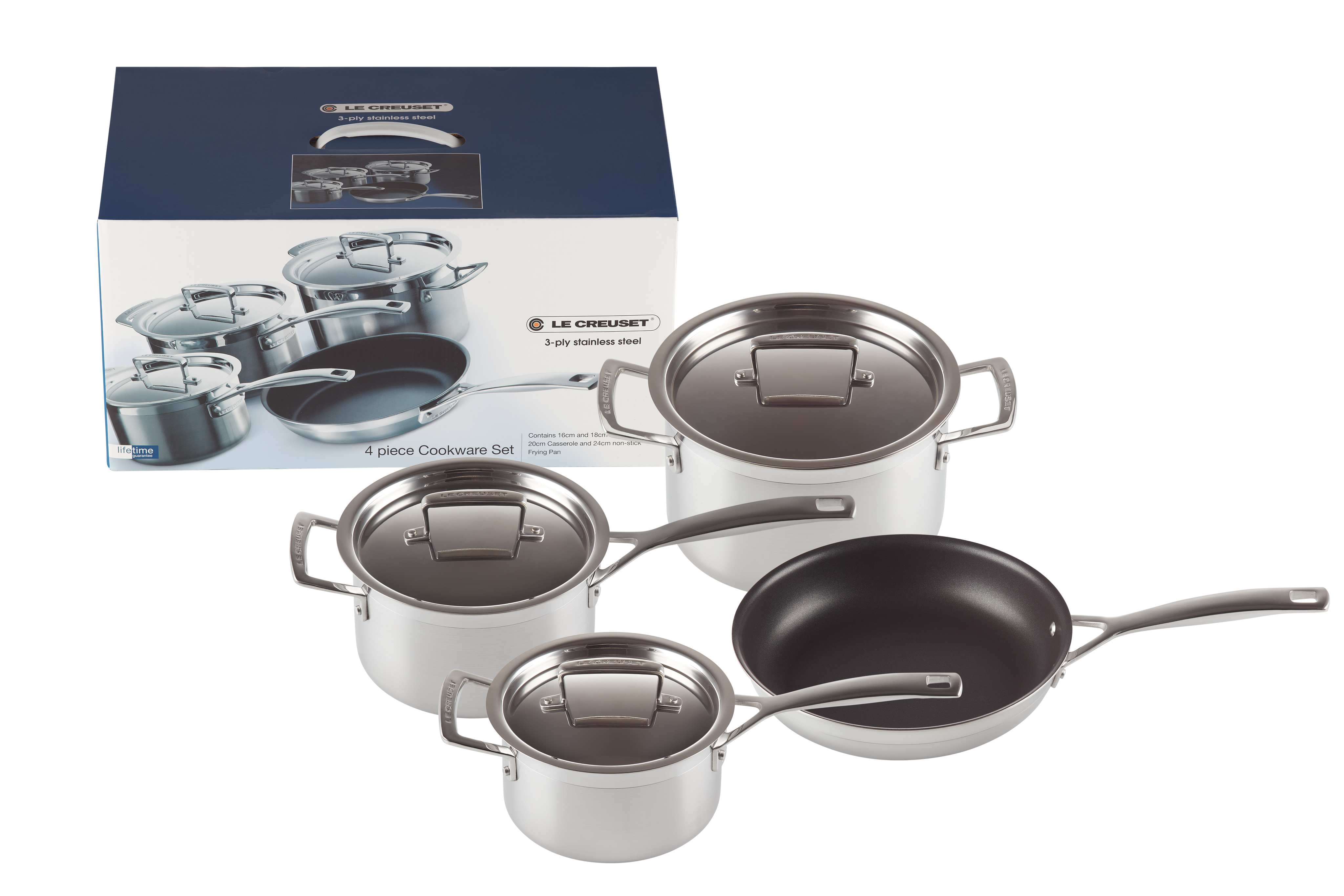 一組四件套,包括三個不同尺寸的鍋子和一個煎鍋,使用方便。