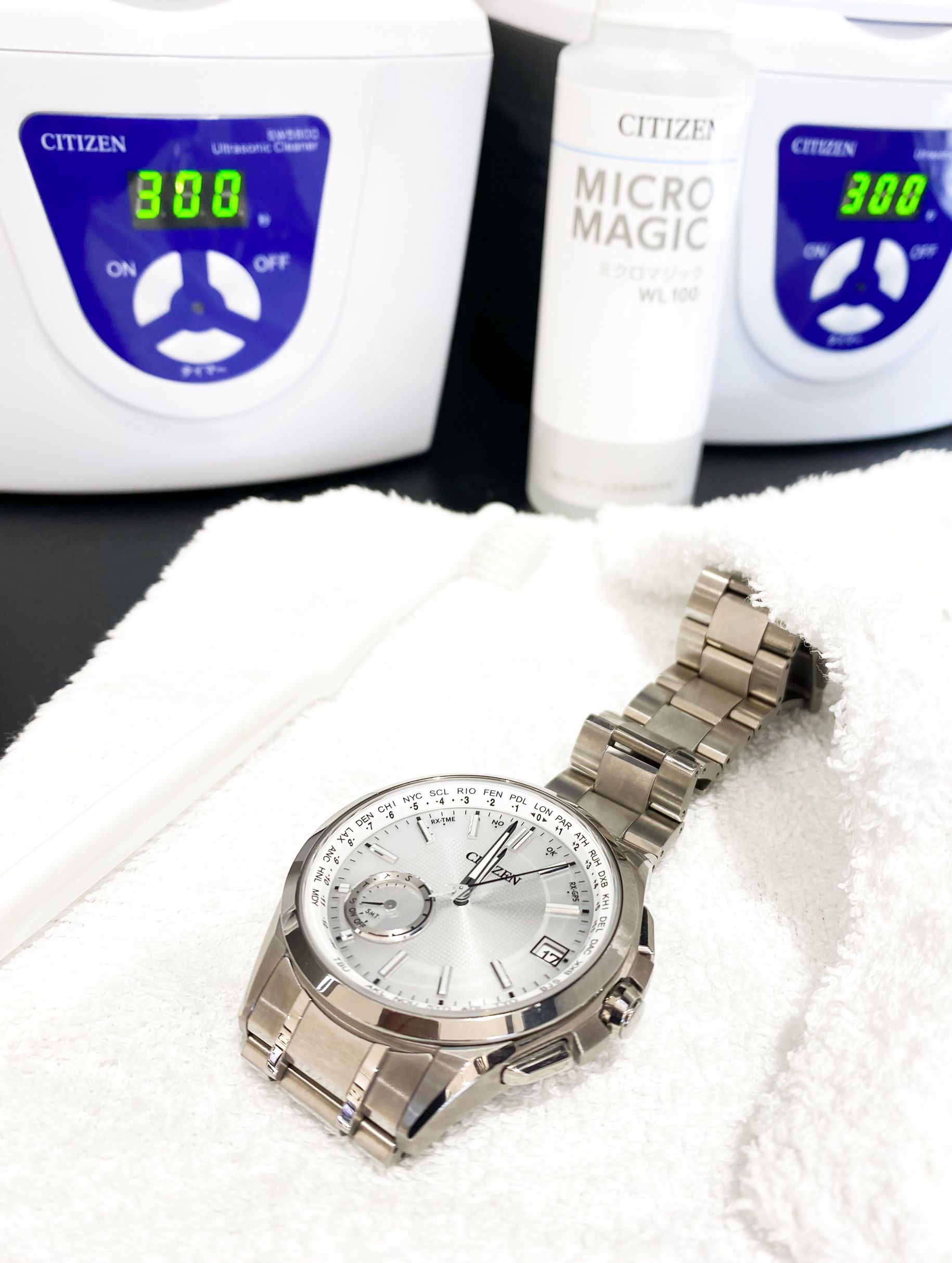 CITIZEN我們使用腕錶超聲波清洗機和特殊腕錶清潔劑'Micro Magic'來清潔您的腕錶錶帶,讓它光潔如新。