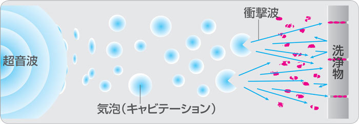 空化氣泡爆破時所產生的衝擊波可粉碎無法進入縫隙中的污垢,並清除用布、刷子或水流無法清除的污垢。