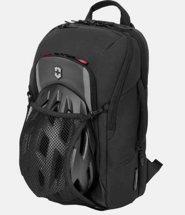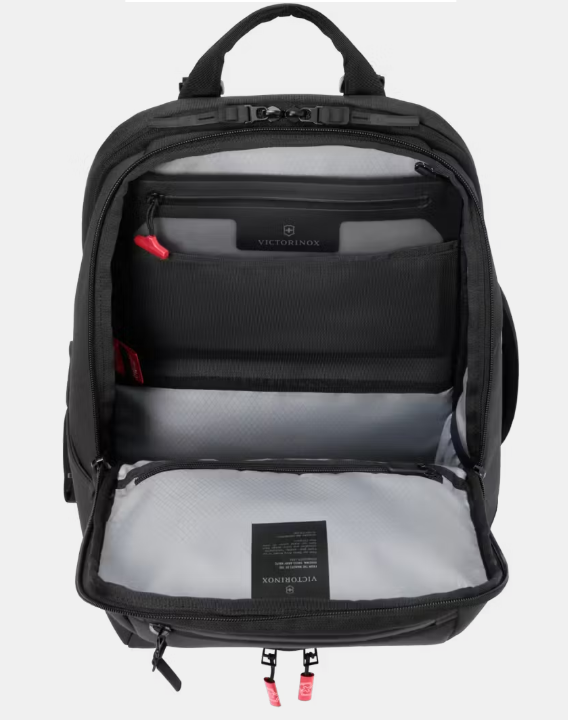 此外,醒目的十字盾形標誌和帶有品牌名稱的紅色陽極氧化拉鍊拉片,強烈突顯了Victorinox品牌的獨特特徵。