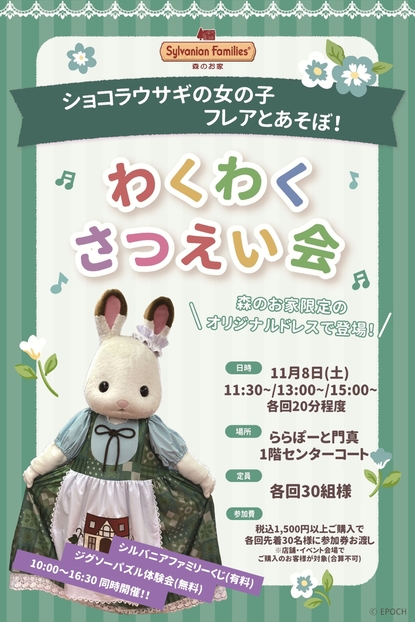 | 品牌概唸 | ■ Sylvanian Families morino ouchi 海外商品、原創商品等種類繁多。請您來體驗一下 Sylvanian Families 的世界。 ■拼圖店傑作 這是一家拼圖專門店,提供從人物到插圖和風景等各種圖案的拼圖,適合所有年齡和性別的人。 |