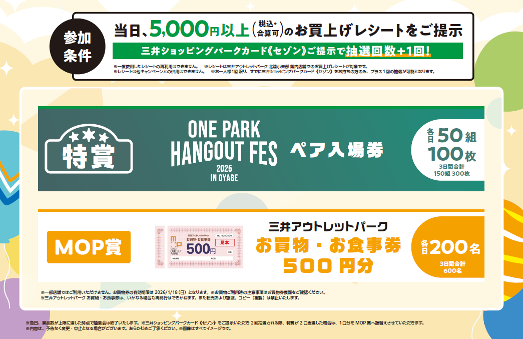 ★★特別獎★★ “ONE PARK HANGOUT FES 2025 in OYABE”雙人票:每天100張(每張50對)(共300張(150對))