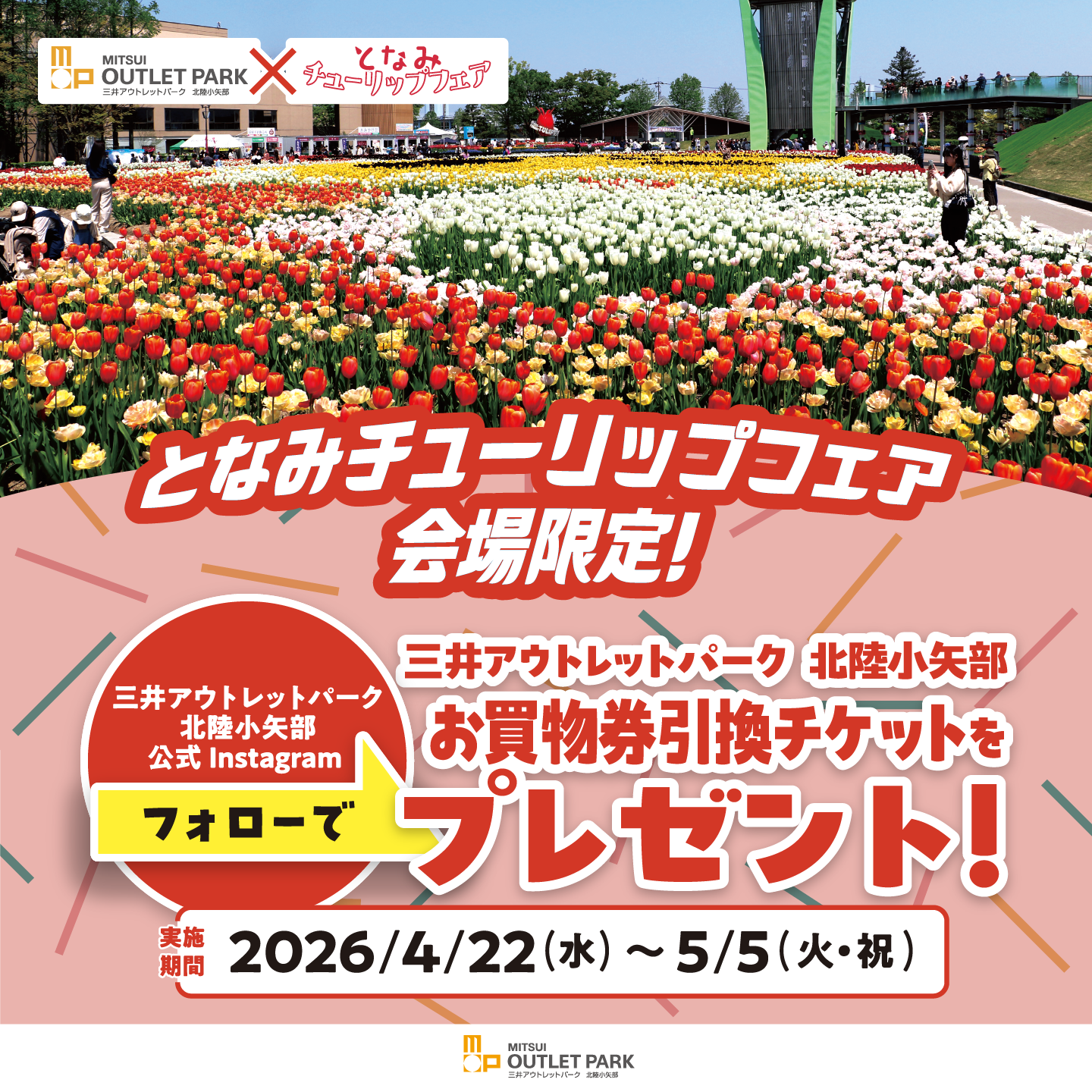 如果您在 Tonami Tulip Fair 會場向我們展示您關注了MITSUI OUTLET PARK北陸小矢部的官方gram contemporary帳號,您將獲得一張購物券兌換券。請前往MITSUI OUTLET PARK北陸小矢部店一樓的General Information憑「購物券兌換券」兌換「MITSUI OUTLET PARK購物餐飲券」。購物券將贈送給前500名顧客。